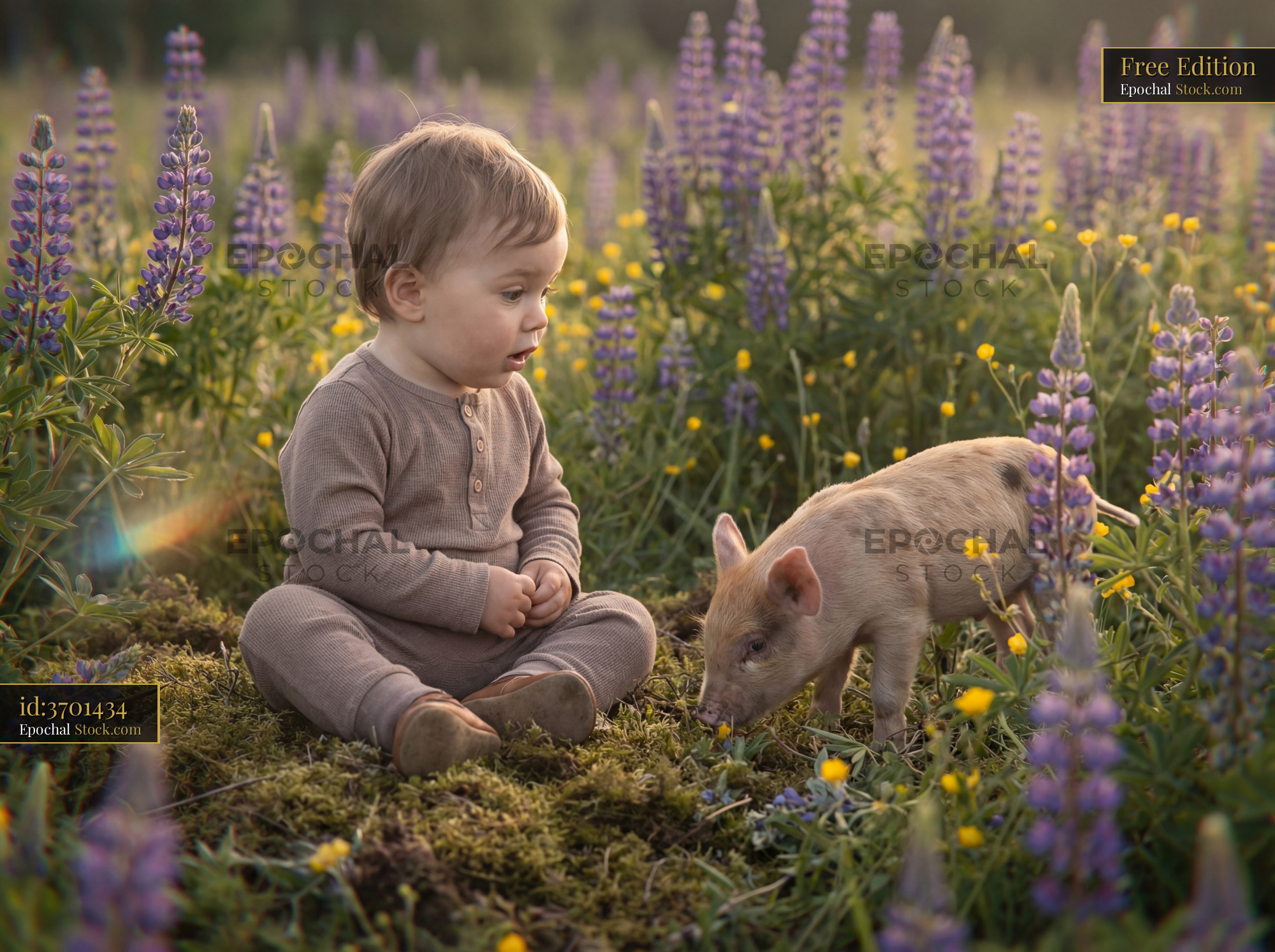 A young child sits on green grass surrounded by purple flowers and small yellow blooms. A piglet explores the ground nearby while the child watches with curiosity.