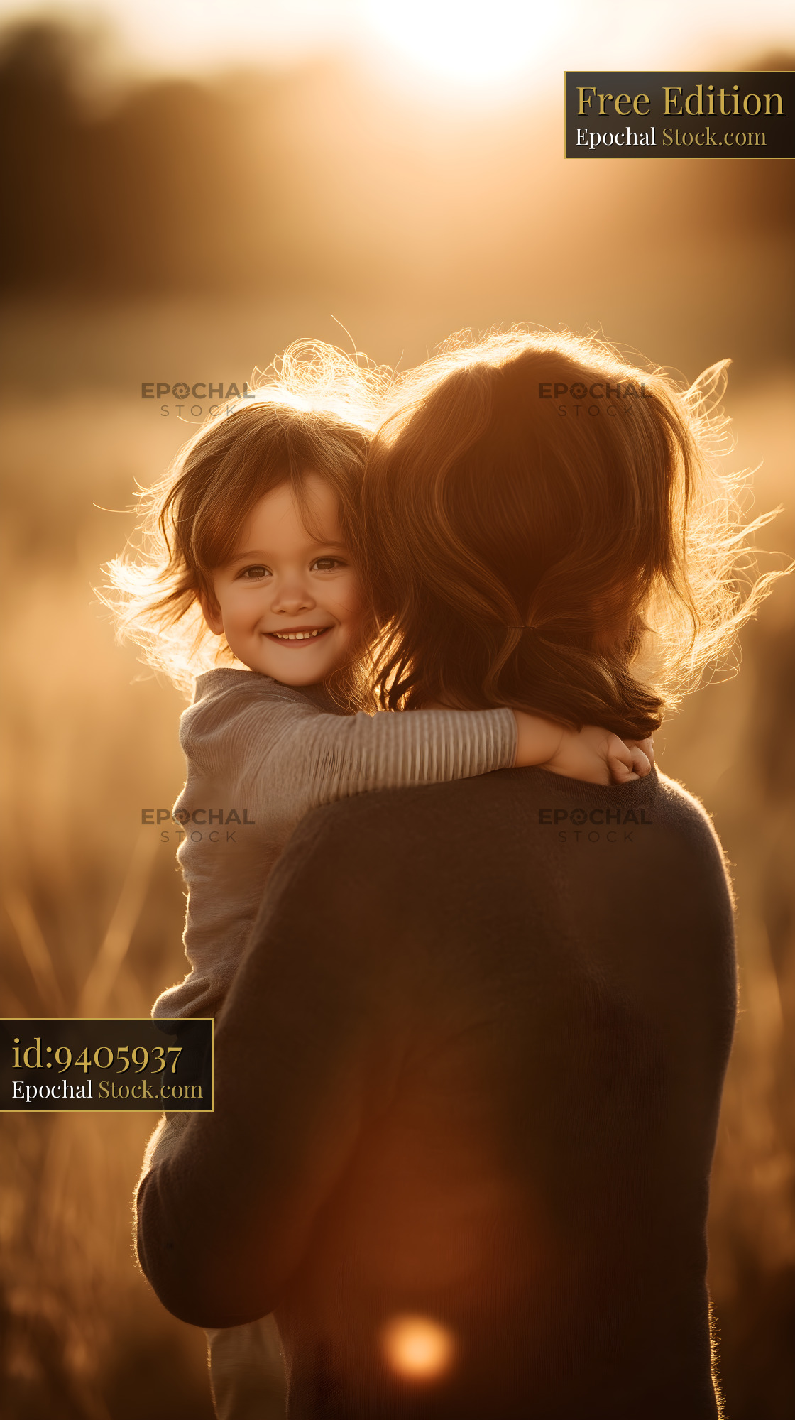 A woman holds a smiling child in her arms as the sun sets. They stand in a field with tall grass, enjoying the warm light of the evening. The child looks happy and playful.