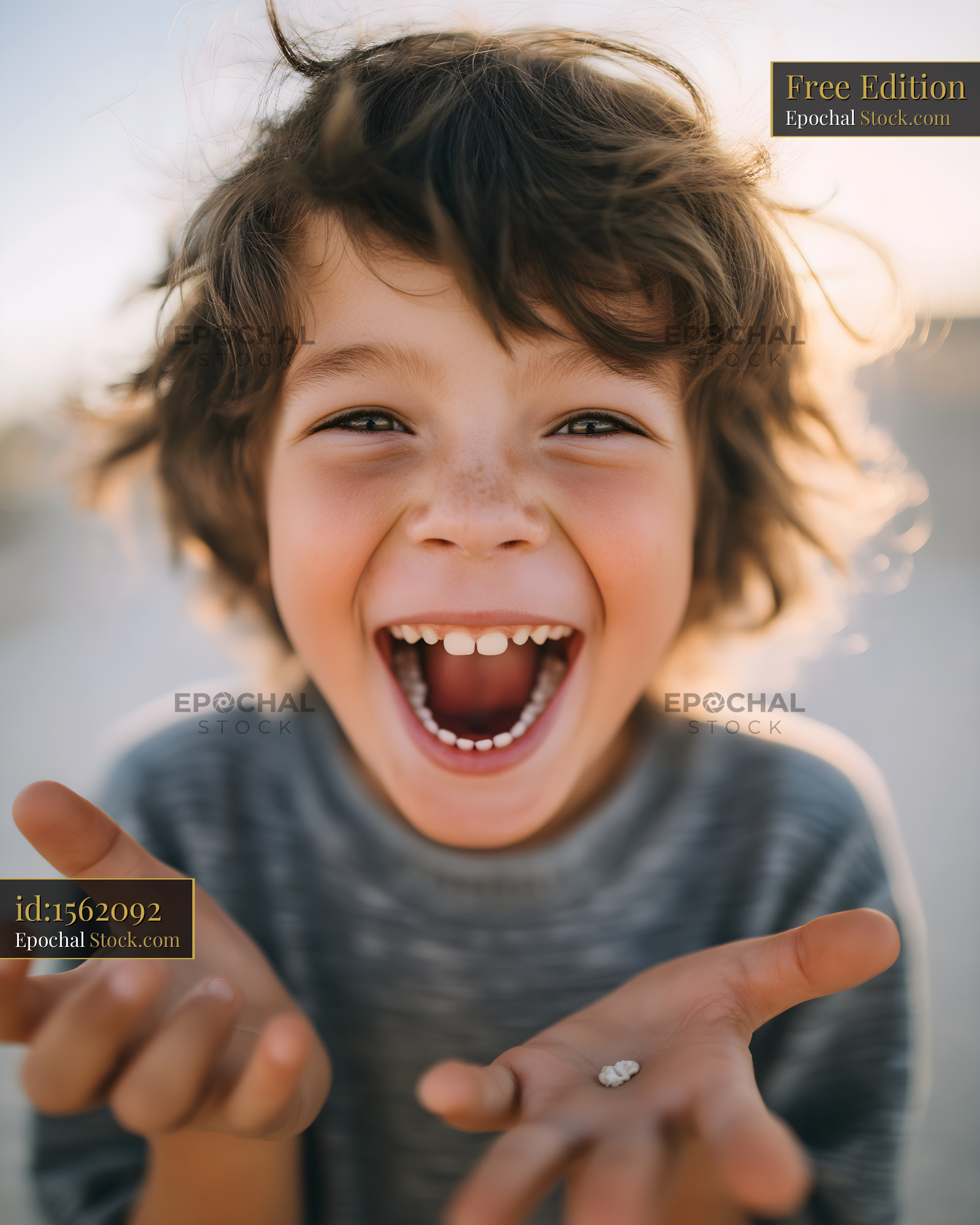 A happy child stands outdoors with sunlight in the background. He opens his hands as he smiles, showing excitement and joy while enjoying a moment of fun.