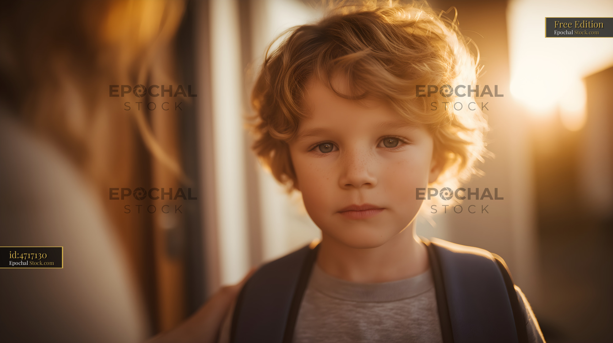 A young boy stands outside with a backpack on his shoulders. The sun sets behind him, creating a warm glow. He looks directly at the camera with a serious expression as the day ends.