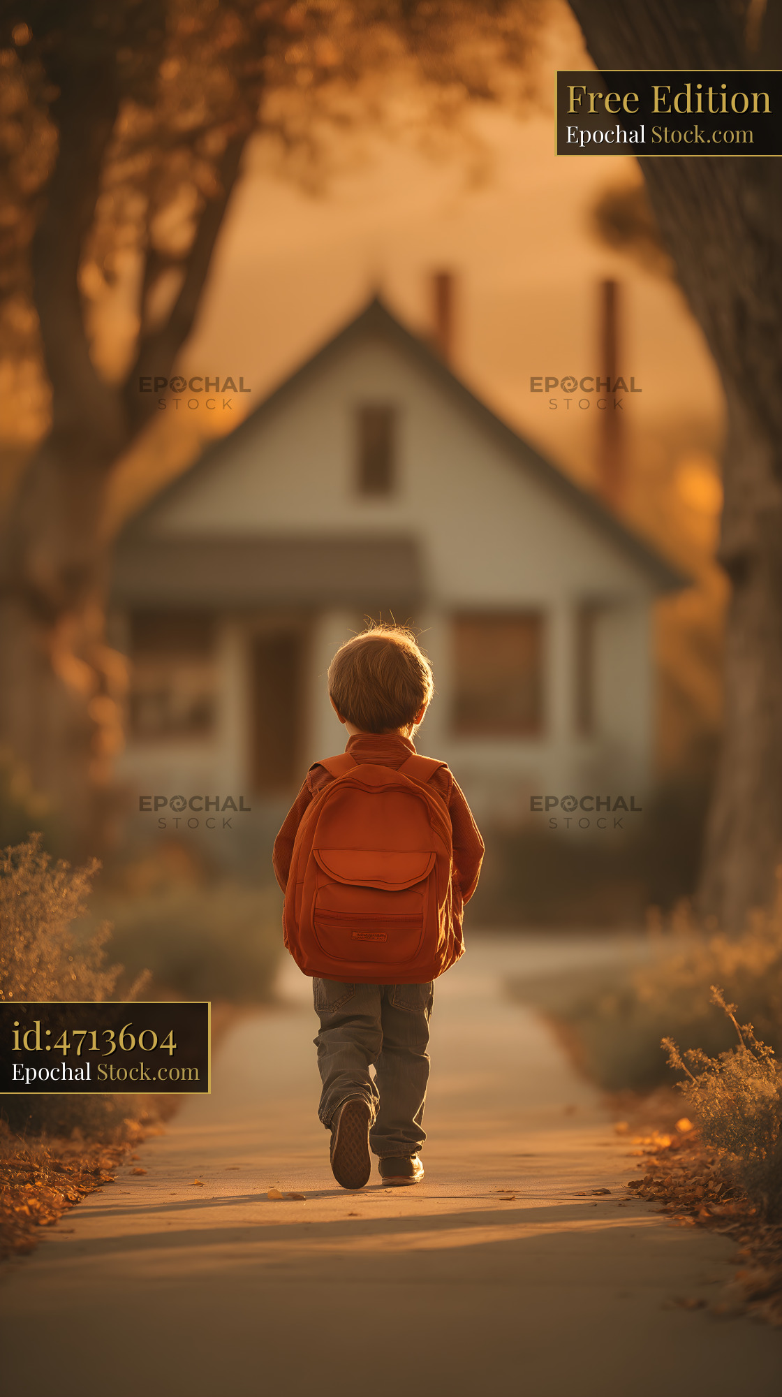 Child walks toward home during sunset with backpack Free Premium Stock Photo