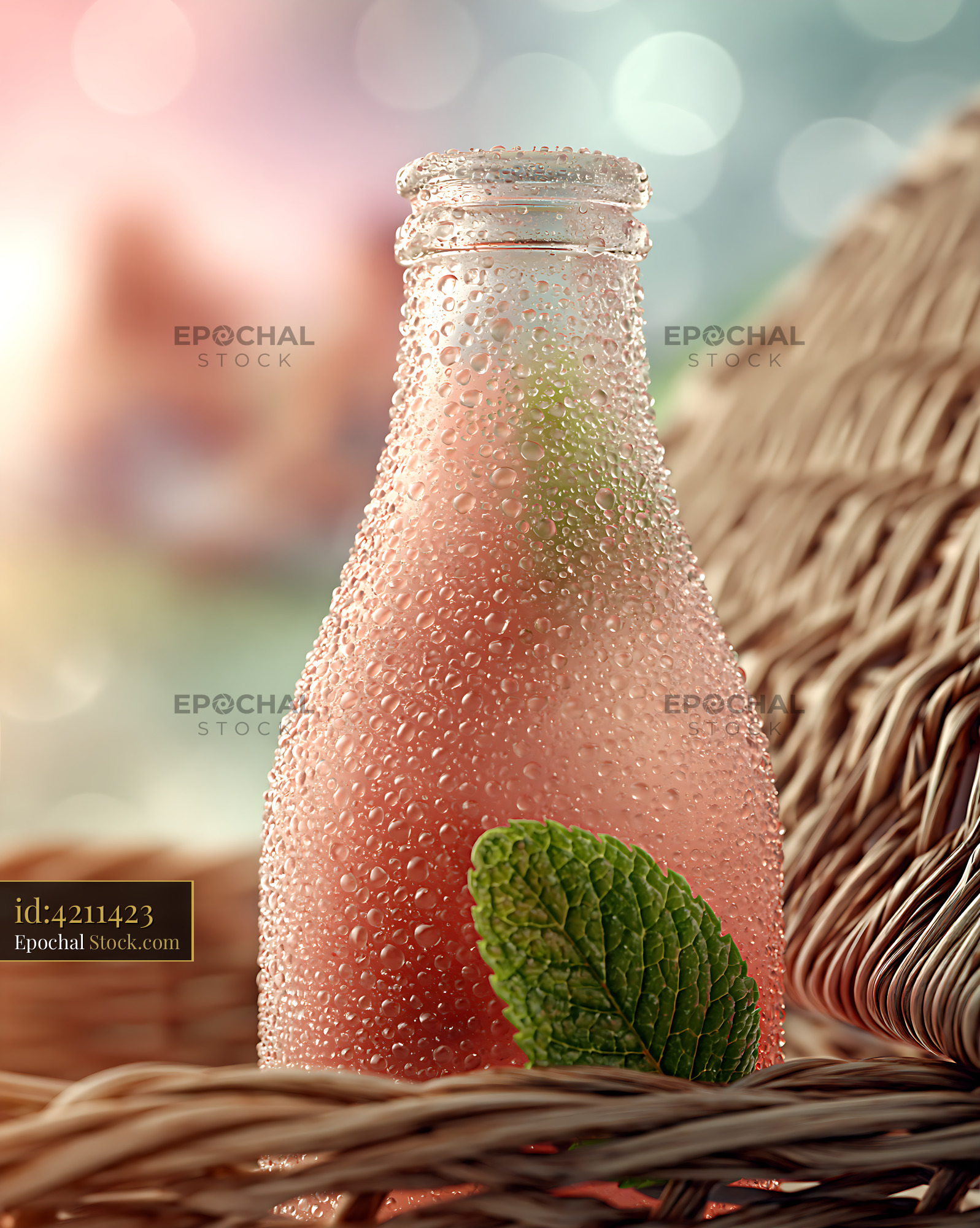 A condensation-covered glass bottle filled with refreshing pink juice and a fresh mint leaf sits in a wicker basket, evoking a summery picnic atmosphere and healthy hydration.