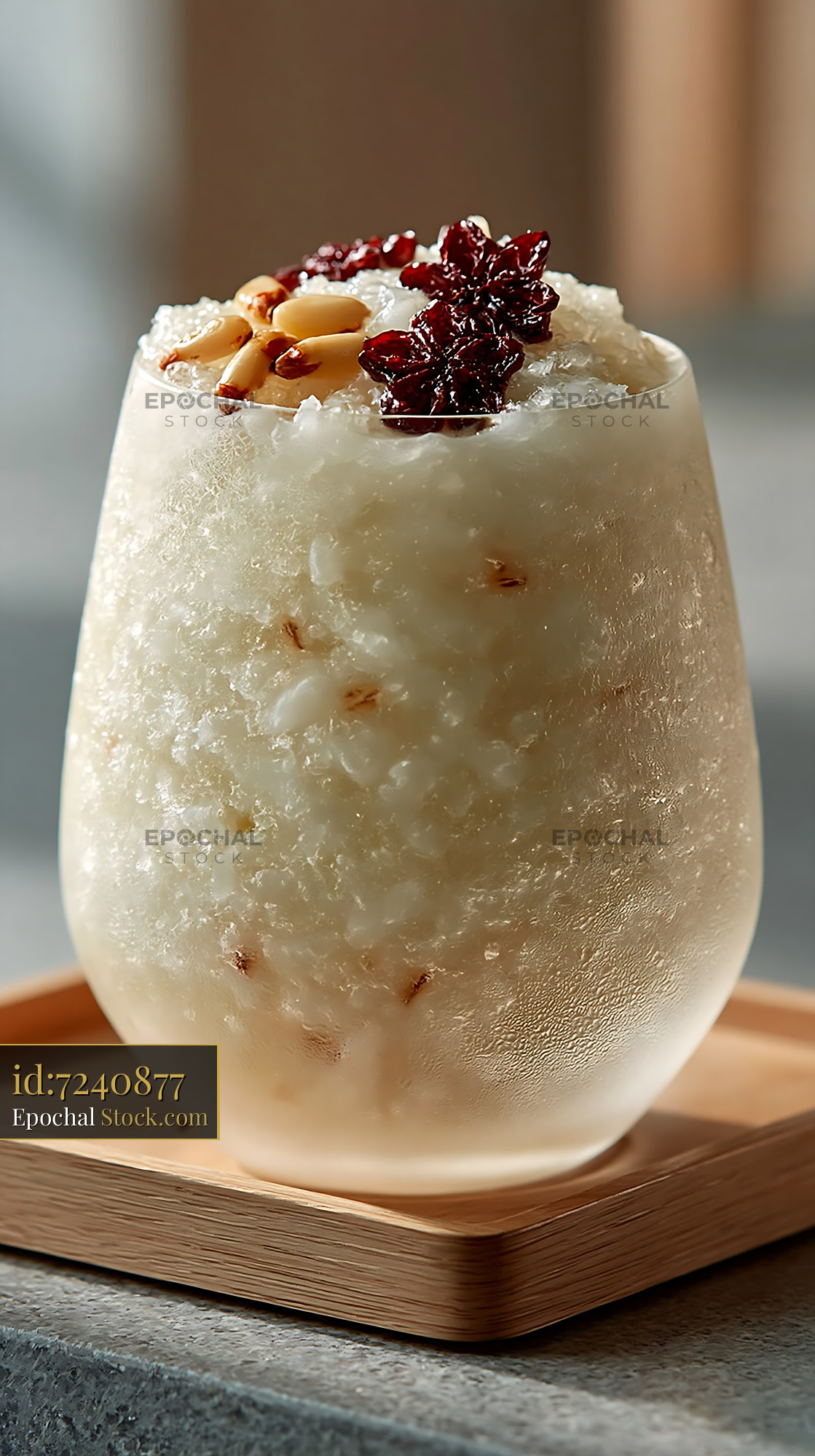 A refreshing glass of sikhye rice smoothie served on a wooden coaster, garnished with pine nuts and jujubes, capturing a blend of traditional Korean flavors and modern cooling comfort.
