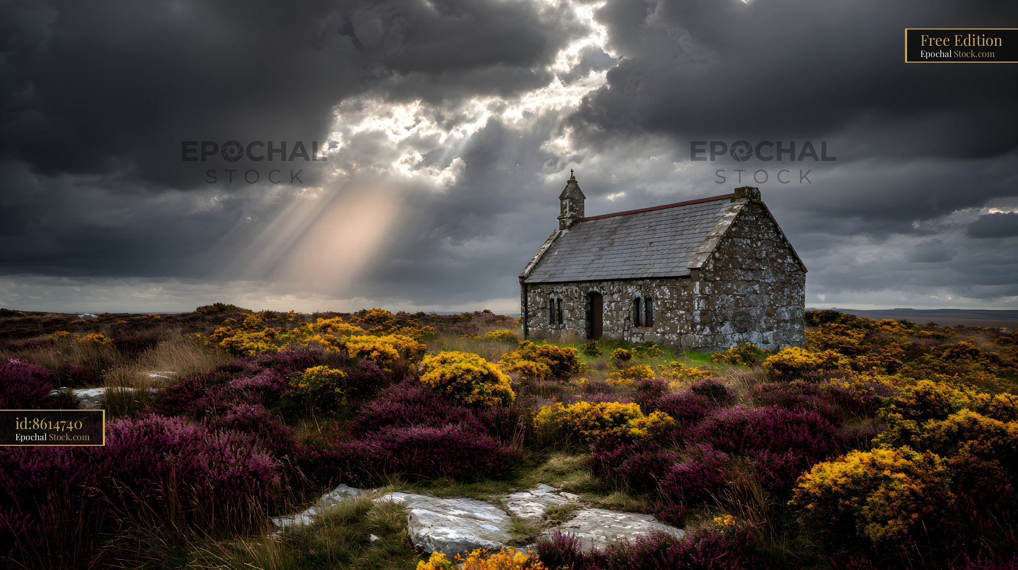 A small stone church is located in a field with purple and yellow flowers. Dark clouds fill the sky while sunlight breaks through in several places. It is a quiet scene of nature and architecture.