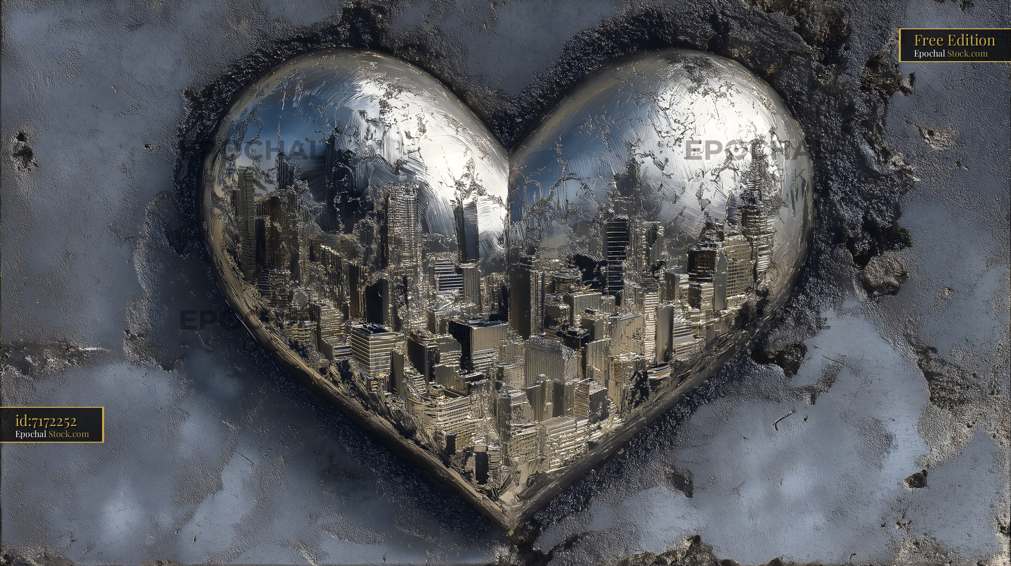 A heart shape made of metal shows a detailed city scene inside. The buildings and structures reflect urban life. This artwork combines love and city life in one piece.