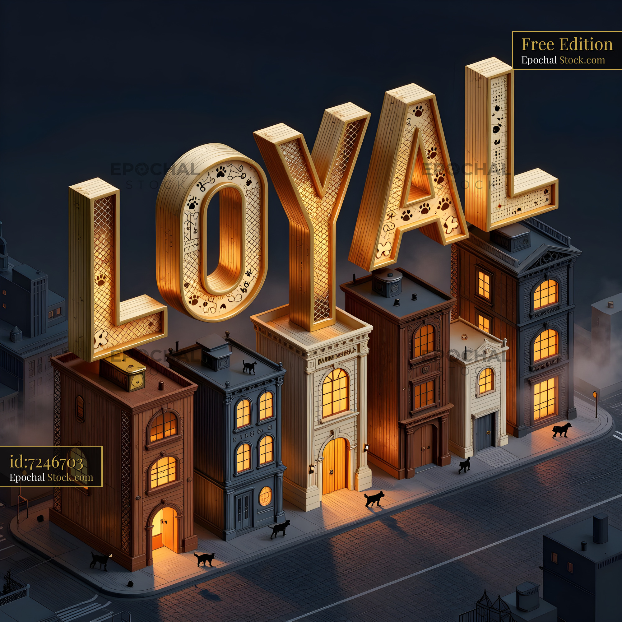 In a city at night, buildings form the word loyal with bright letters. Cats walk along the street as lights glow from windows. The scene depicts a quiet urban setting.