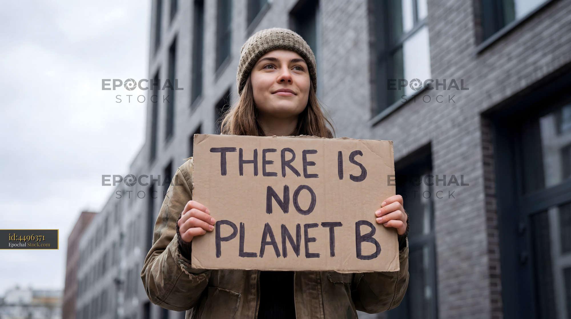 A person stands in a city holding a cardboard sign that says There is no planet B. This takes place on a cloudy day in an urban area with modern buildings.