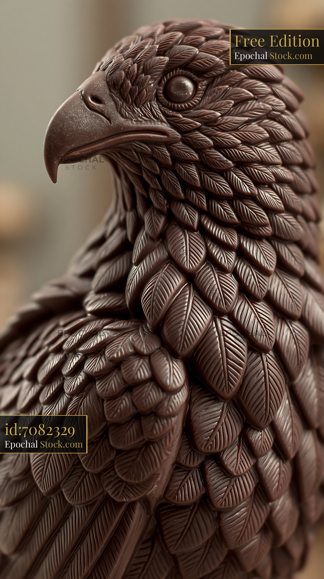 Close up of a chocolate eagle sculpture with intricate feather details