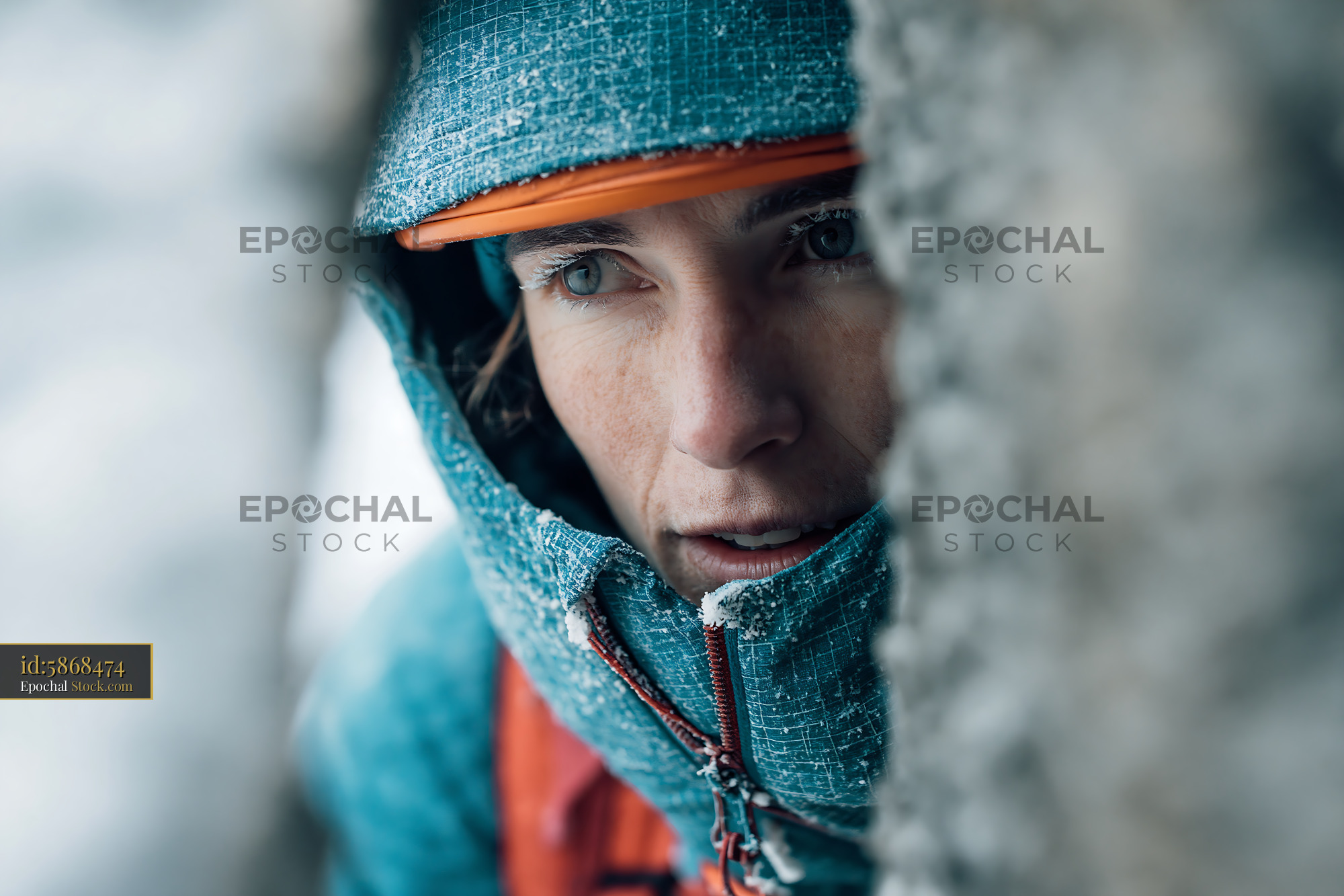 A focused young woman mountaineer peers through a rocky gap, her face and gear covered in light snow and frost, capturing the intensity, endurance, and harsh conditions of high-altitude climbing.