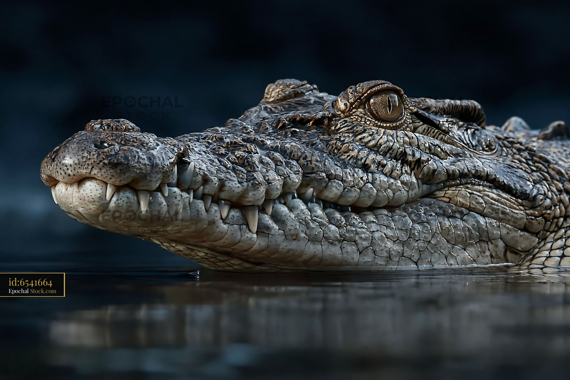 Detailed profile of a crocodile head emerging from dark water, showing sharp teeth and textured scales, evoking themes of ancient danger, patience, and survival.