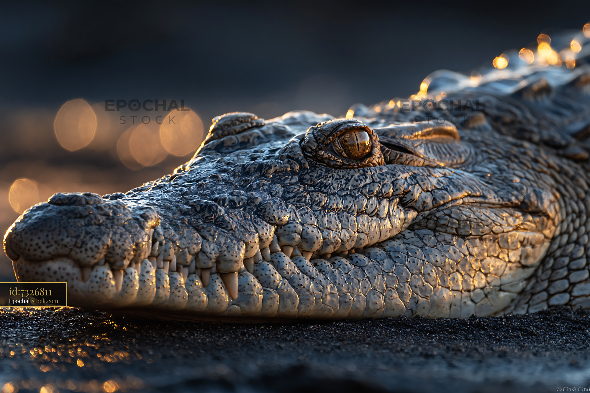 Close up of a saltwater crocodile resting on sand at sunset