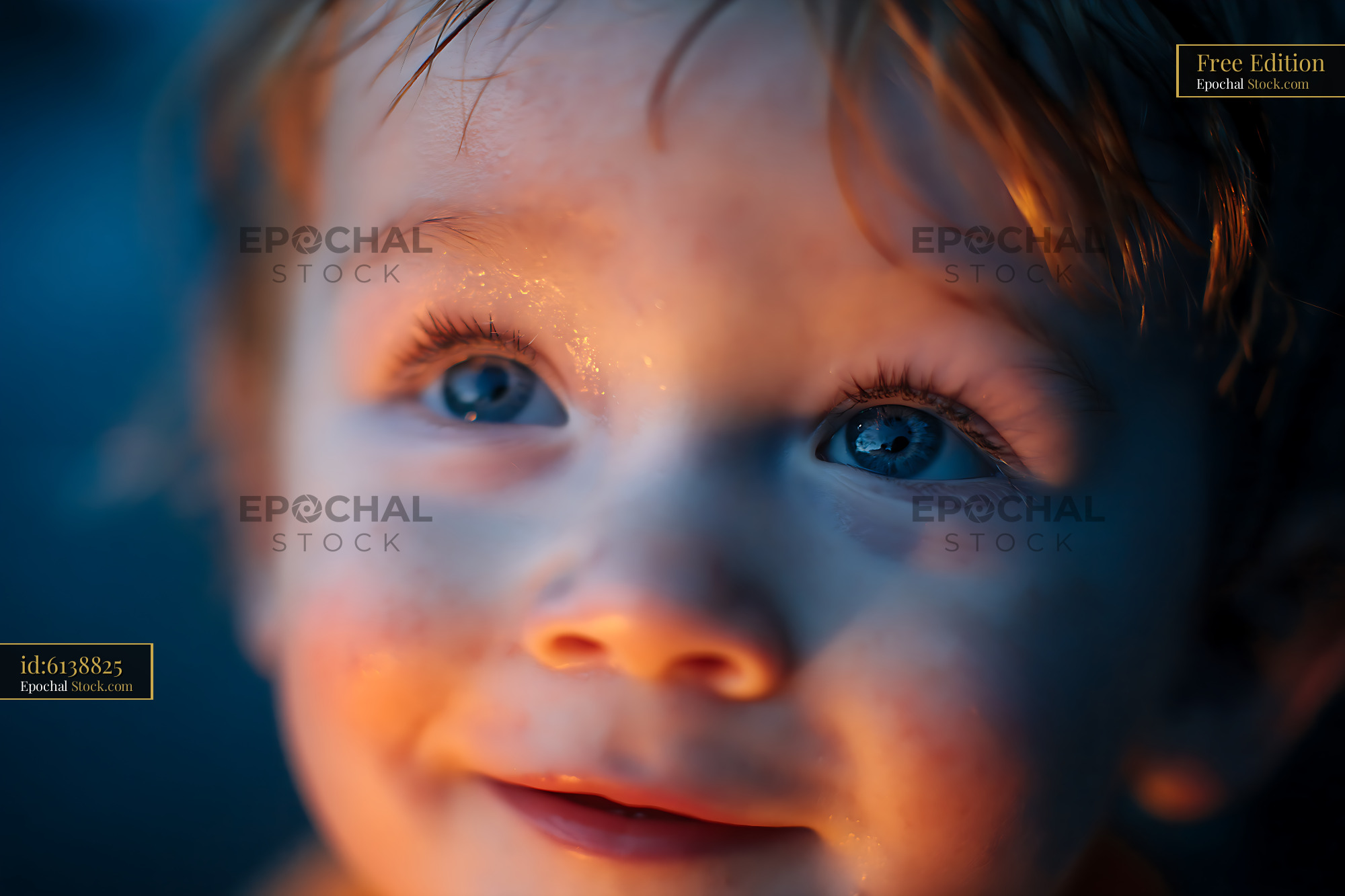 A close up portrait of a young child with bright blue eyes looking up with wonder, illuminated by a warm orange glow against a soft blue background, evoking innocence and curiosity.