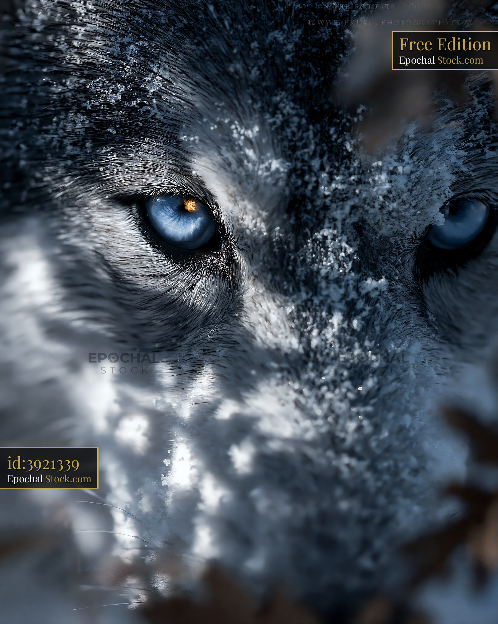 Close up of a wolf with piercing blue eyes and snow on fur