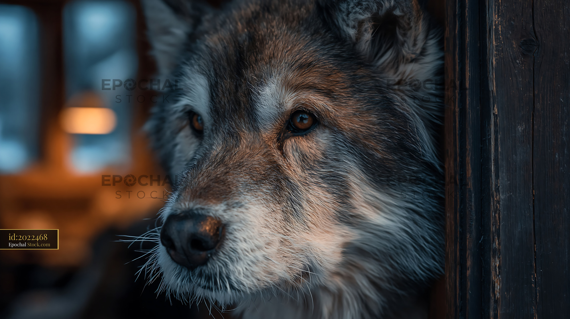 Close up of a wolfdog looking out from a wooden cabin at dusk