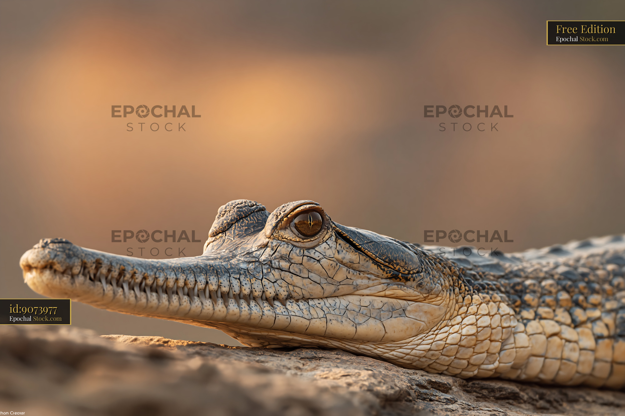 A detailed profile shot of a young gharial crocodile resting on a rocky shore during golden hour. The image captures the unique texture of its scales and its distinctive long snout, evoking themes of wildlife conservation, prehistoric beauty, and the quiet patience of nature.