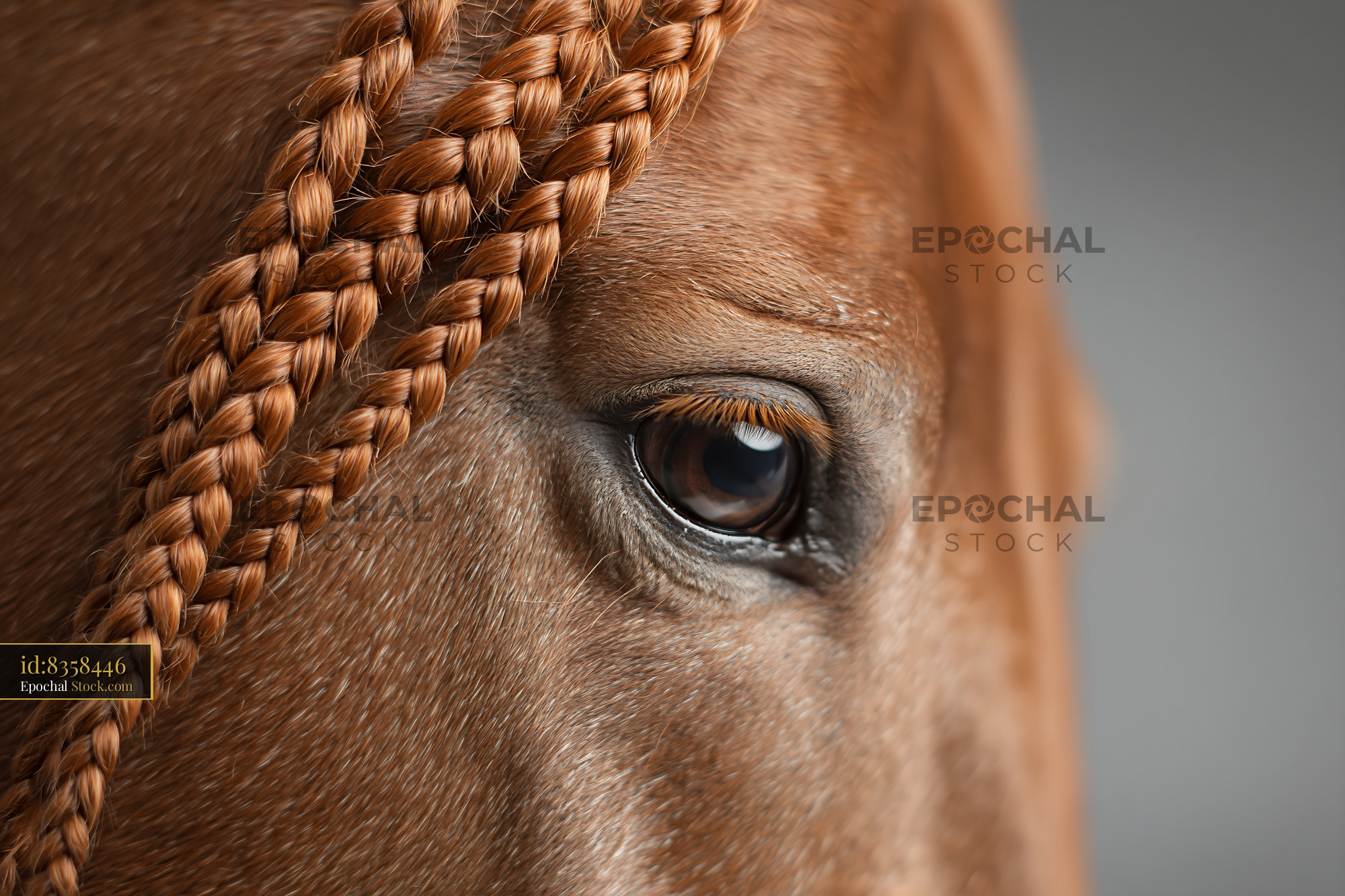 A detailed macro shot of a sorrel horse's eye featuring intricately braided hair, symbolizing the deep bond and care in equestrian sports and animal companionship.