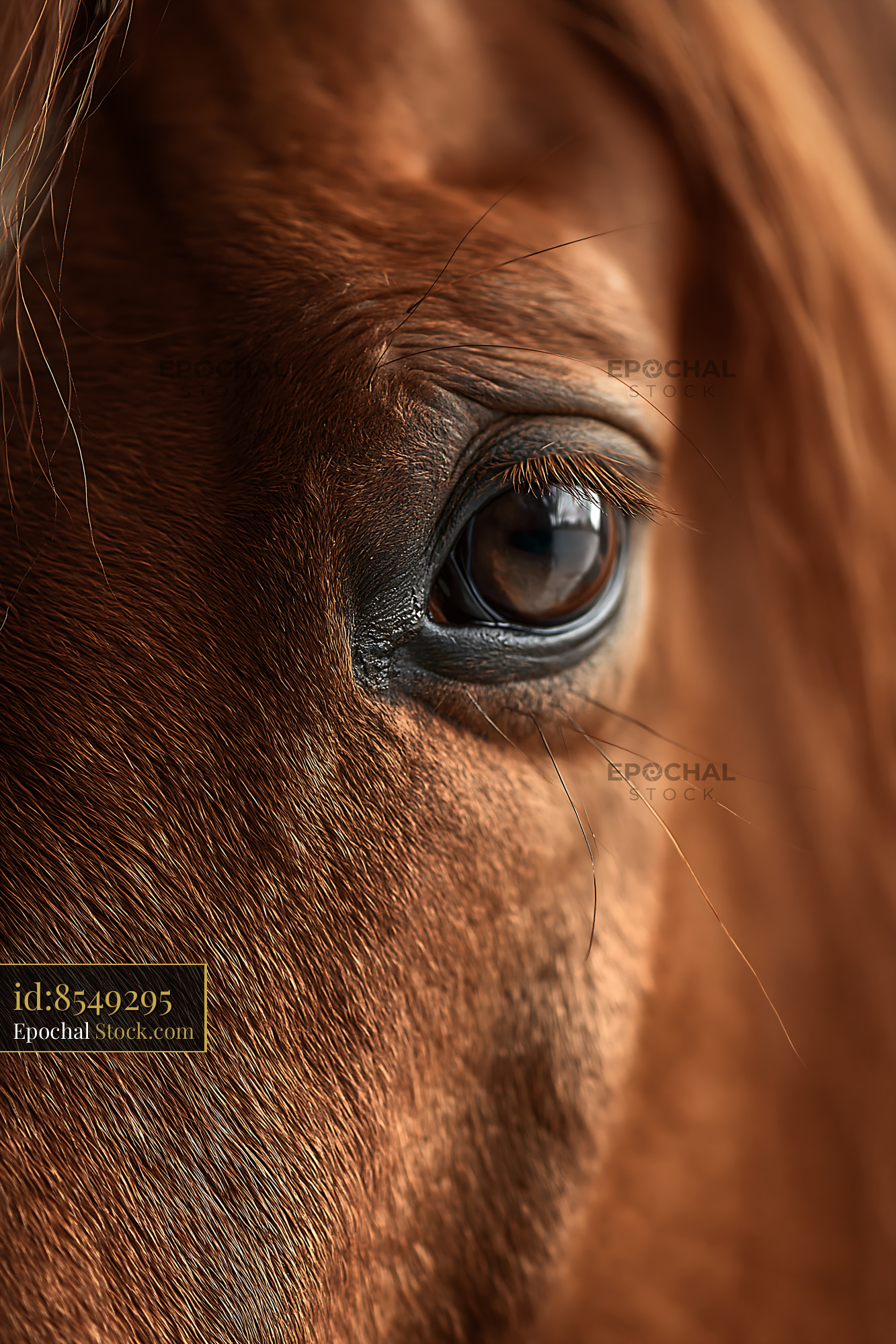 A detailed close-up of a brown horse eye, capturing the depth and gentle expression of the animal. This intimate portrait emphasizes the connection between human and nature, highlighting trust and soul.