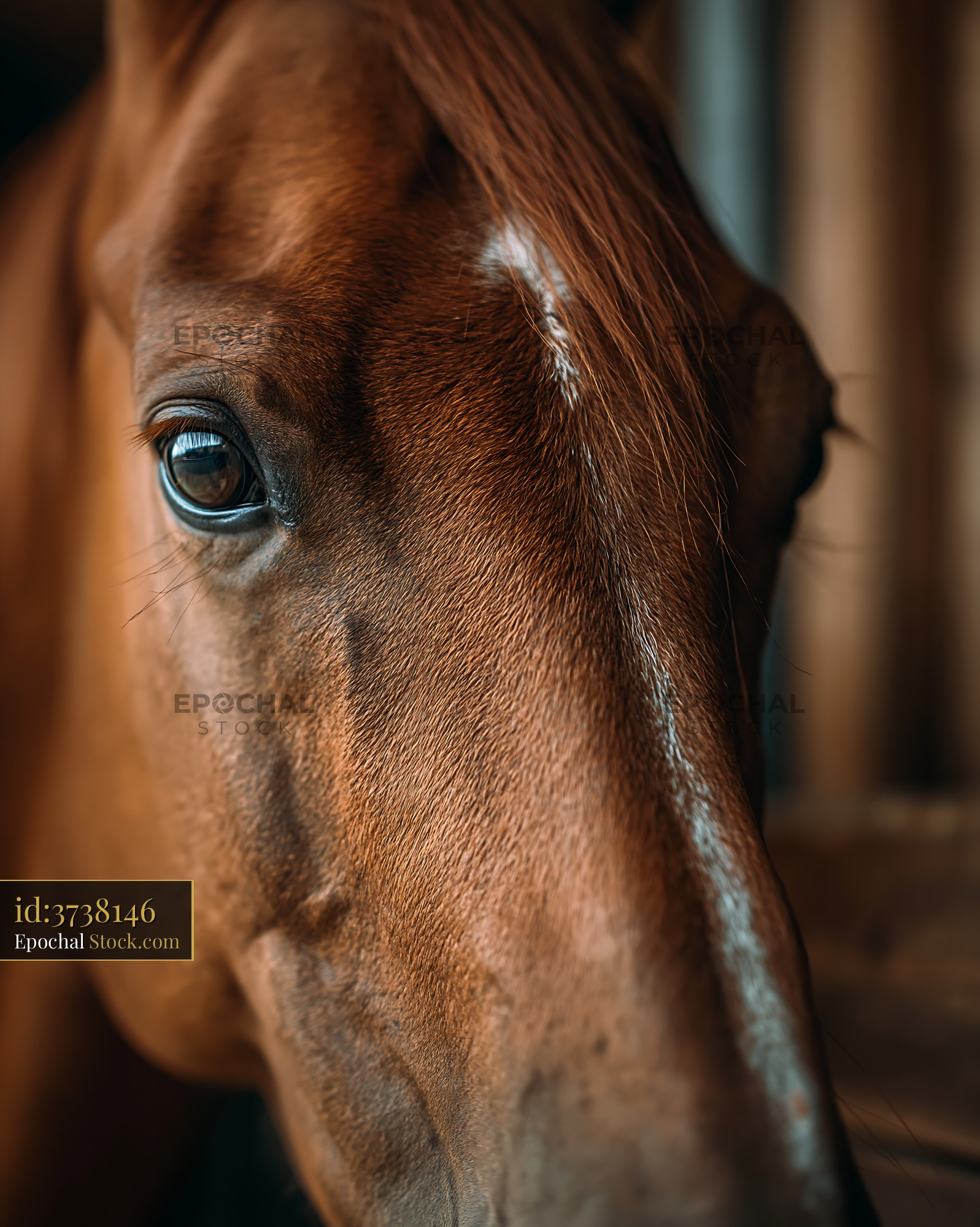 Close-up portrait of a chestnut horse with a soulful eye in a stable