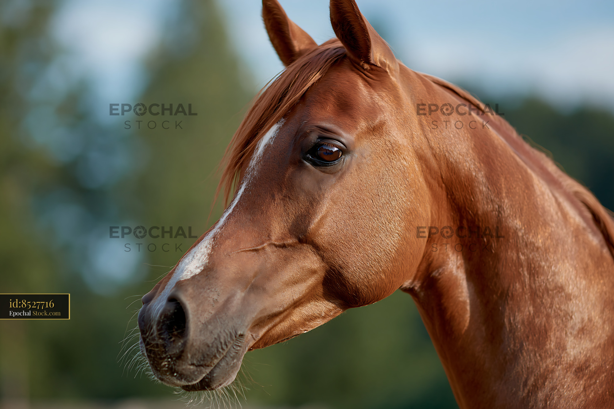 A majestic chestnut horse looks alertly into the distance, its reddish coat gleaming in soft daylight against a blurred forest backdrop, evoking a sense of grace and natural beauty.