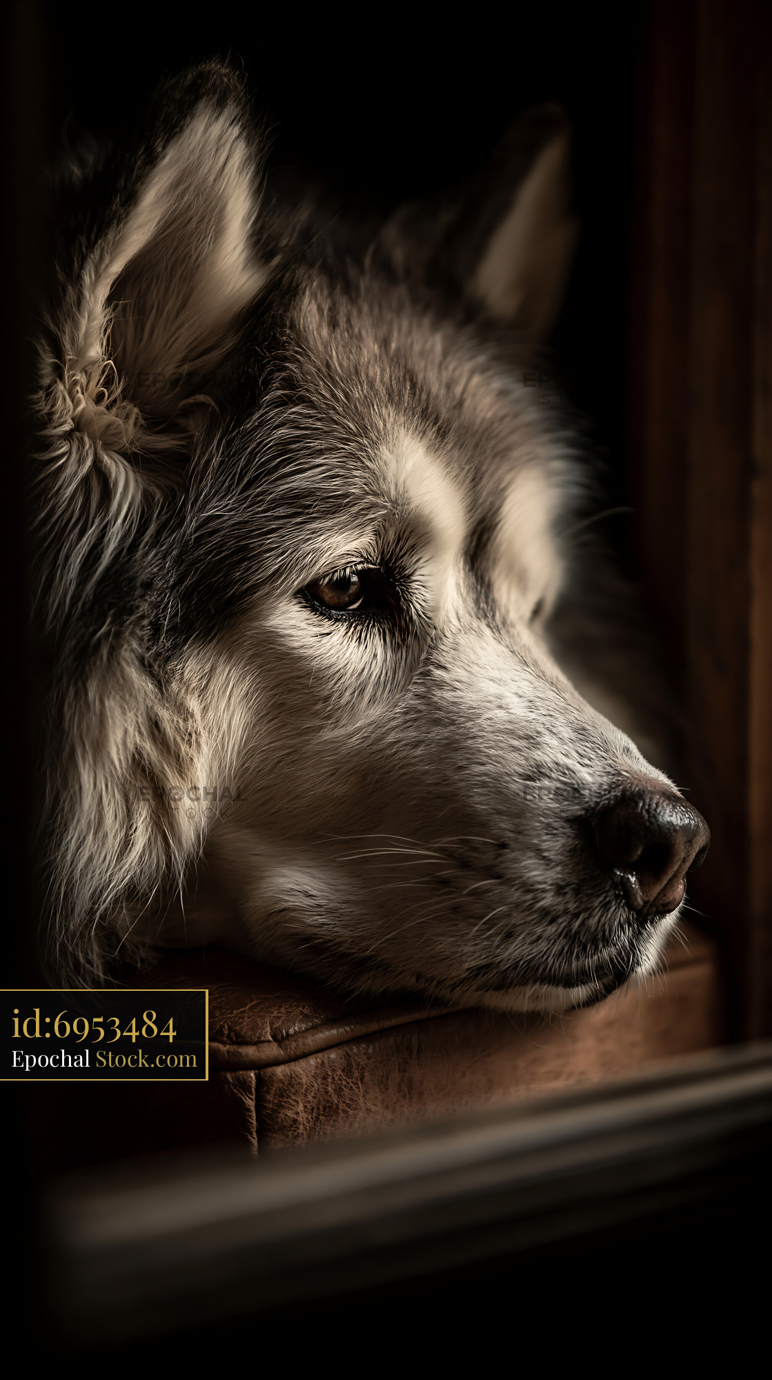 A melancholic close-up portrait of a Siberian husky resting its head on a leather surface. The moody lighting highlights the dog's expressive eyes, evoking feelings of loyalty, patience, and longing.