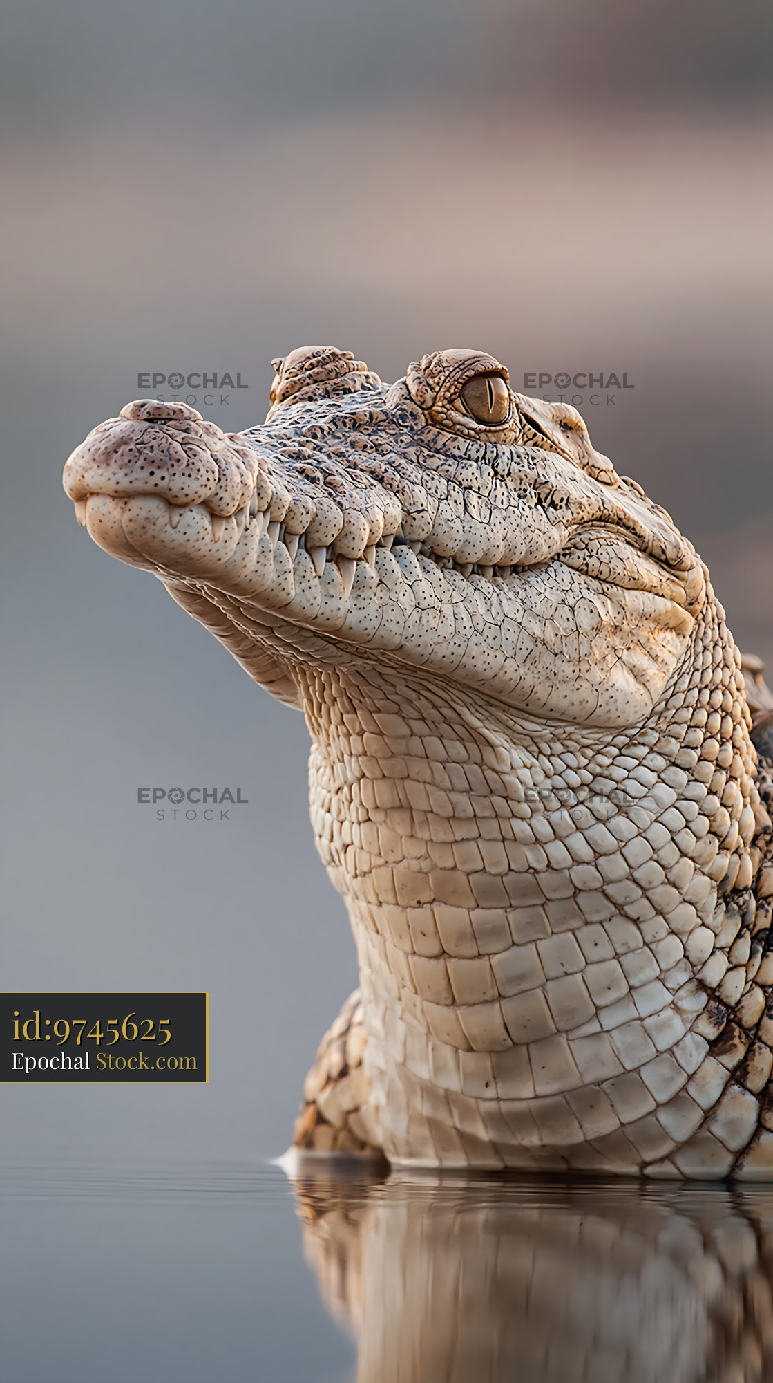 A detailed close up portrait of a saltwater crocodile head rising from the water, highlighting its textured scales and watchful eye, representing power, patience, and the wild nature of predators.