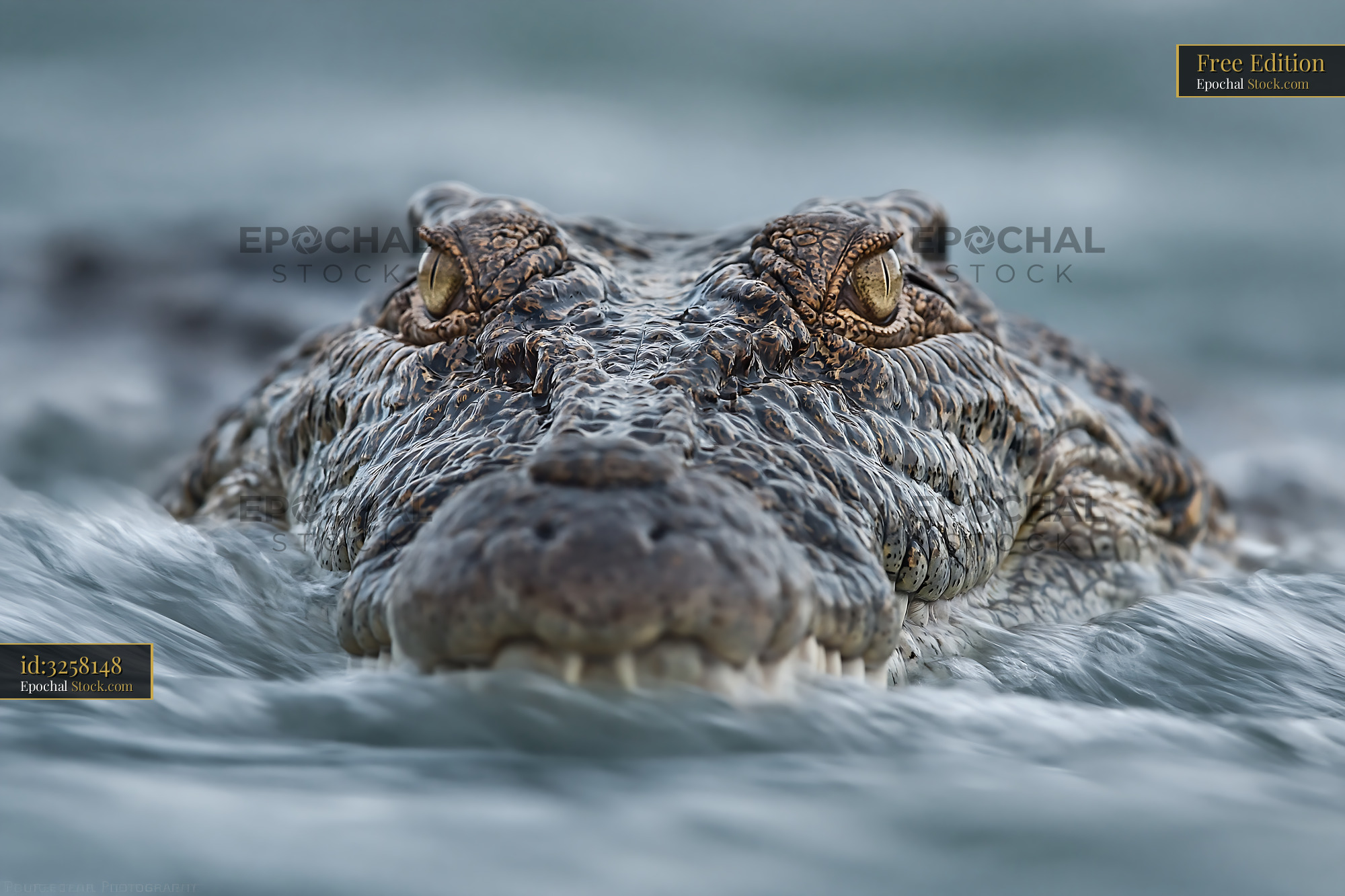 A detailed front view of a large crocodile emerging from the water, focusing on its intense yellow eyes and textured scales, capturing a sense of primal power and wild nature.