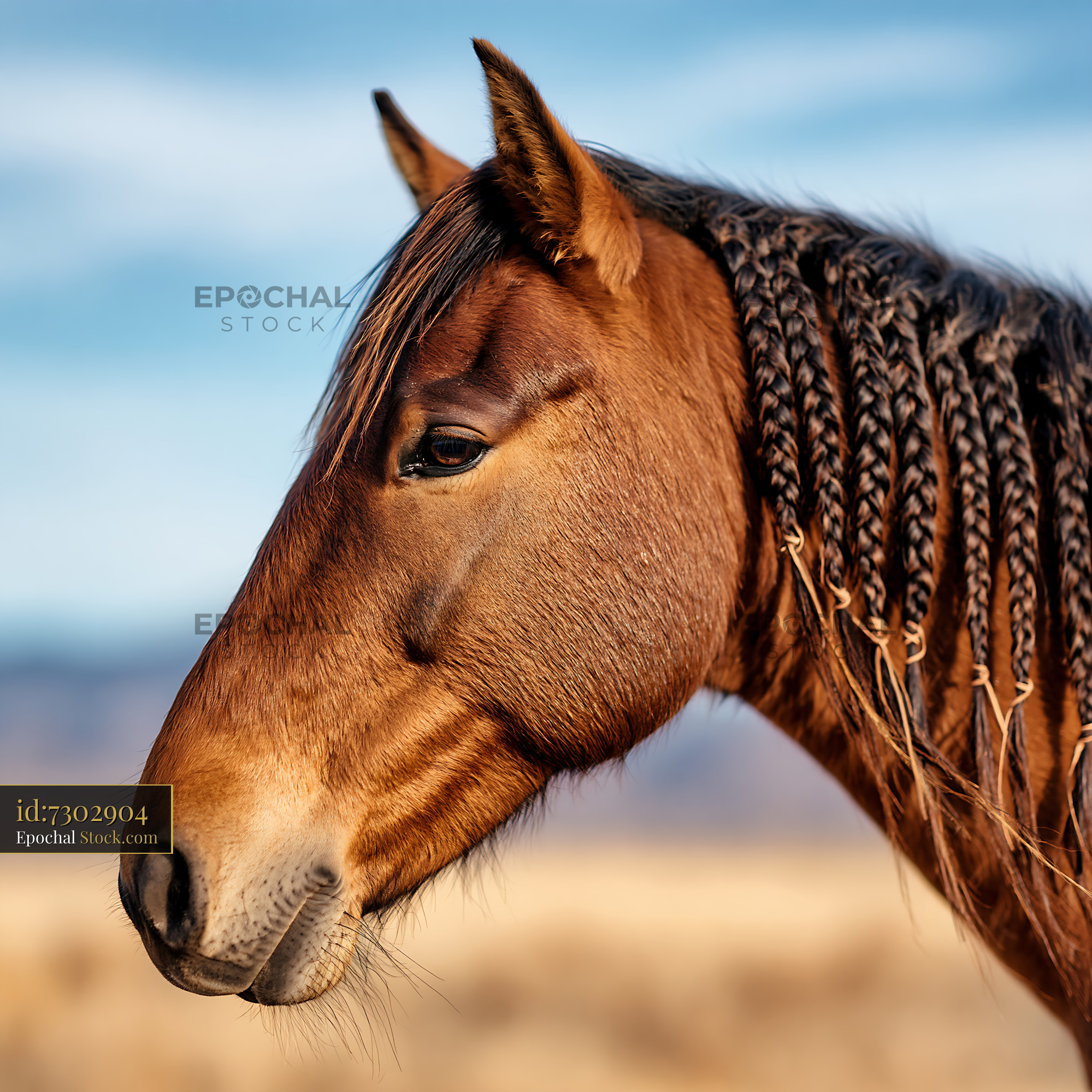 Close up profile of a brown horse with an intricately braided mane