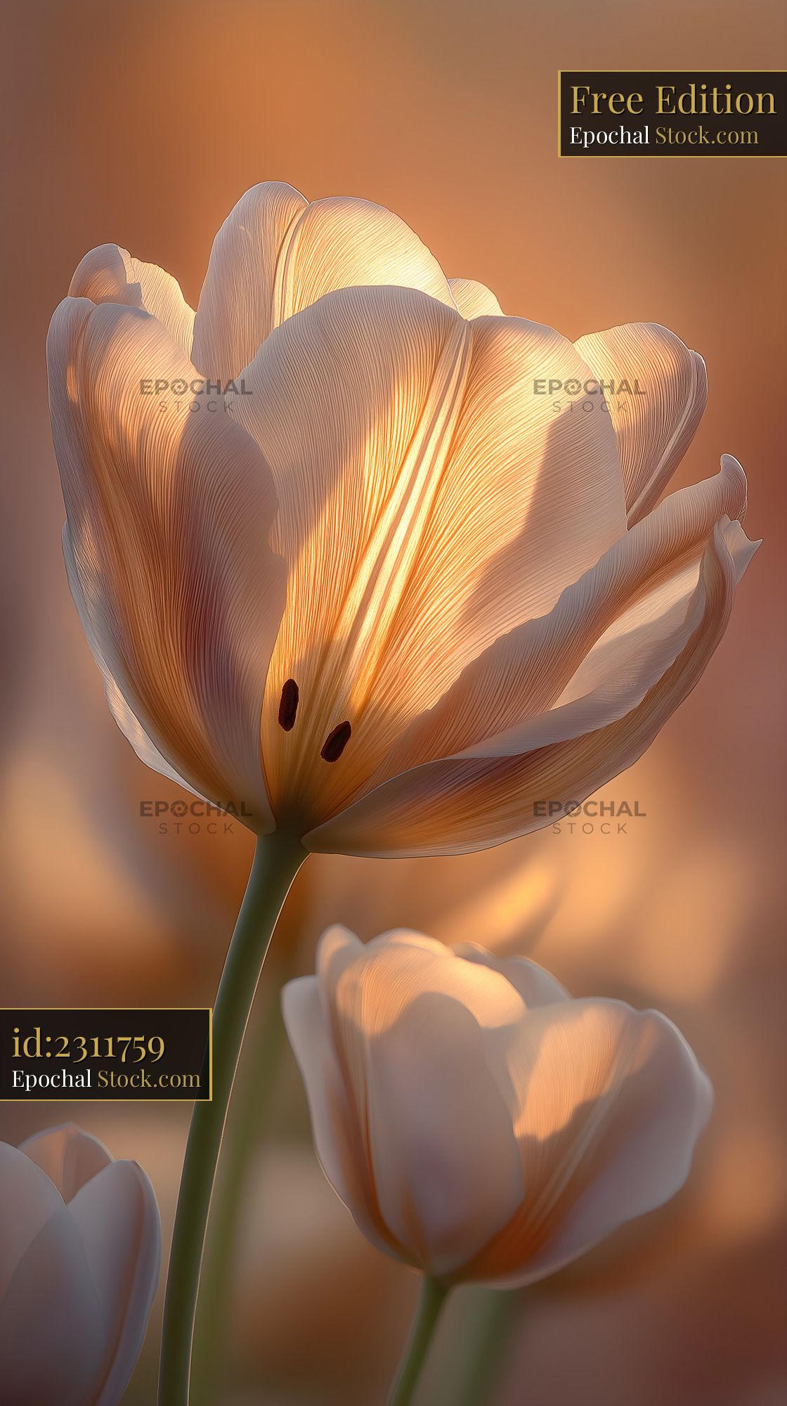 Tulips are illuminated by soft light during the evening. The petals show delicate details and colors as the sun sets behind them. The scene captures the beauty of nature at this time.