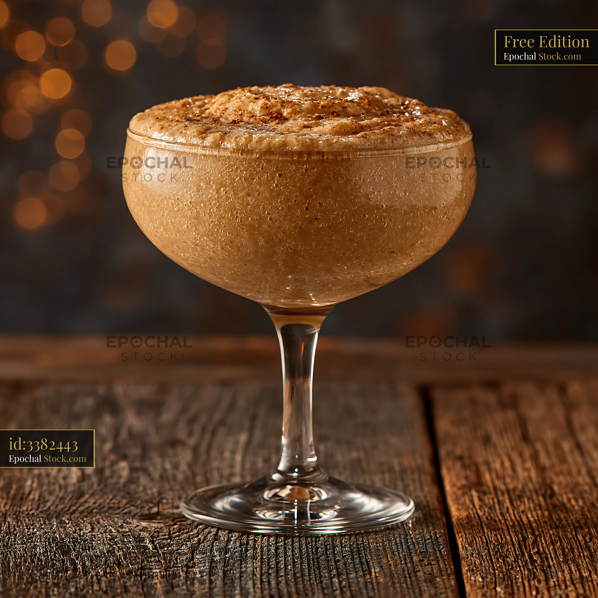 A rich and frothy cloudberry cream milkshake served in an elegant glass coupe, set against a rustic wooden background with warm, festive bokeh lighting that evokes a sense of cozy indulgence.