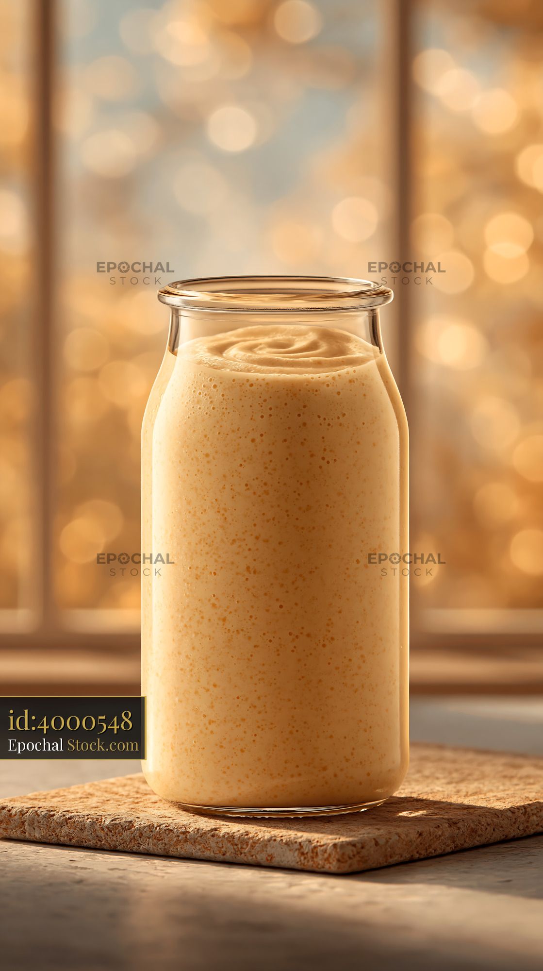 Cloudberry cream milkshake in a glass jar on a cork coaster at sunset