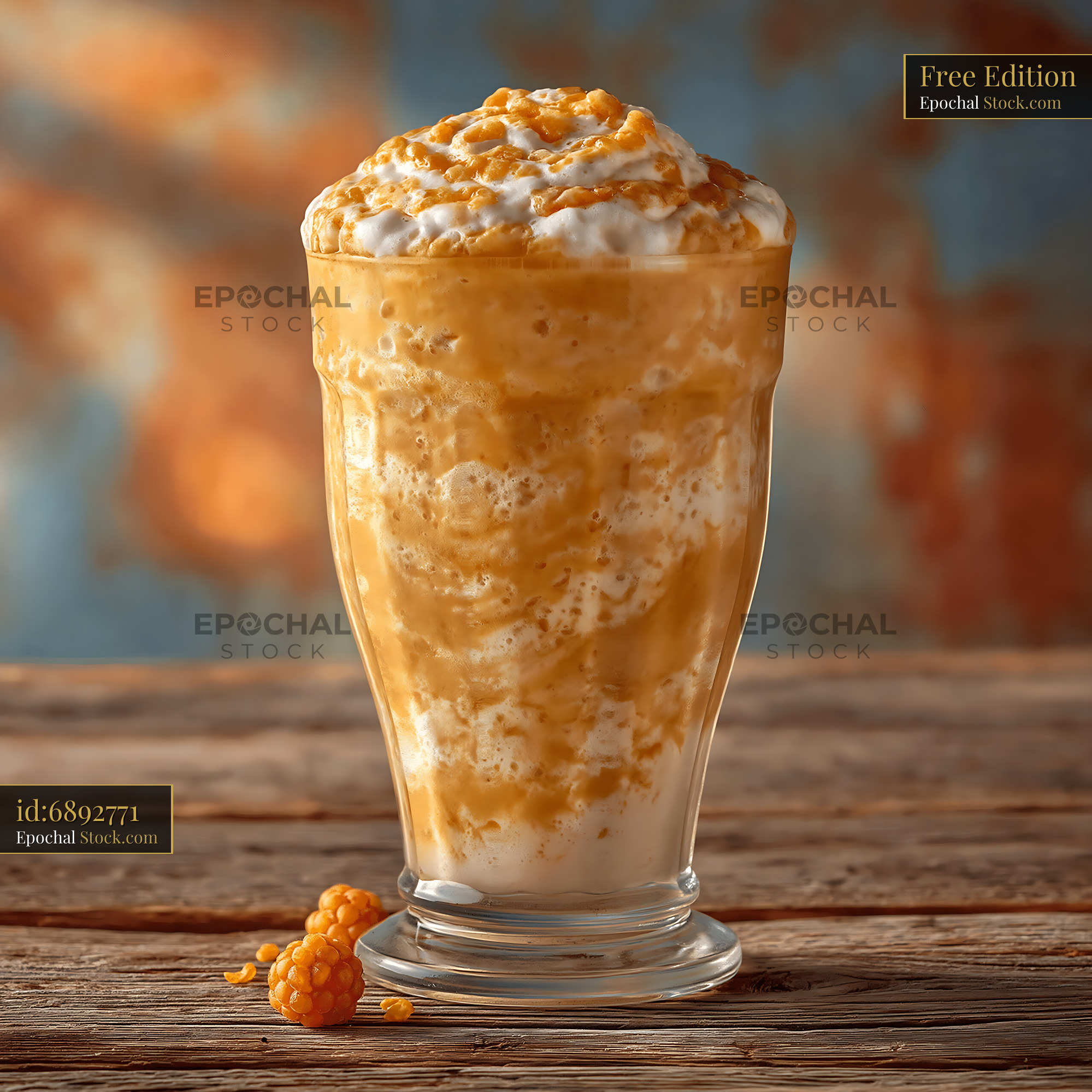 A refreshing cloudberry cream milkshake served in a tall glass on a rustic wooden table, capturing the essence of Scandinavian summer indulgence and artisanal dessert craft.