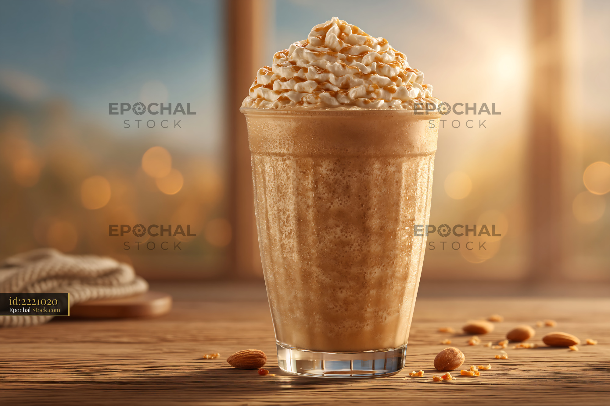 A refreshing cloudberry cream milkshake topped with whipped cream and caramel drizzle, served on a wooden table at sunset, evoking a sense of indulgence and cozy summer evenings.