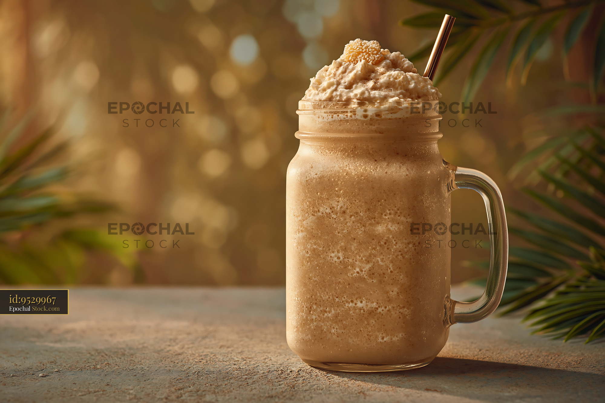 A creamy cloudberry cream milkshake topped with whipped cream in a mason jar, set against a warm tropical background with palm leaves and golden sunset light.