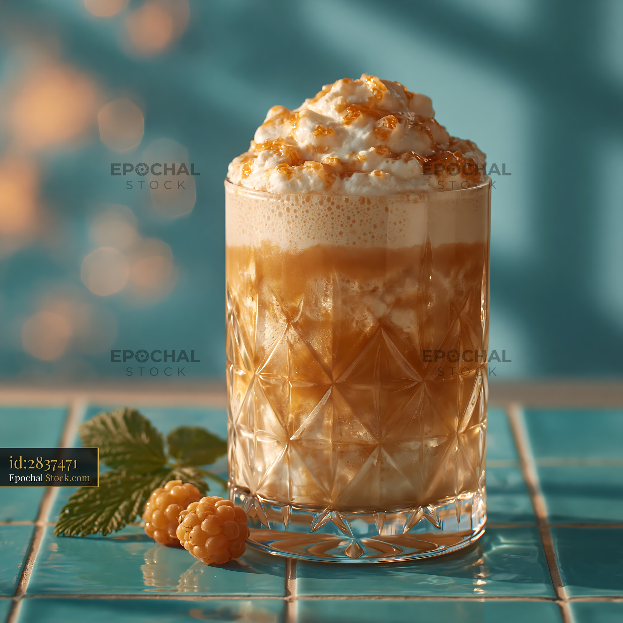 A refreshing cloudberry cream milkshake topped with whipped cream and golden berries, set on a blue tiled surface, evoking a sense of sweet indulgence and summer nostalgia.