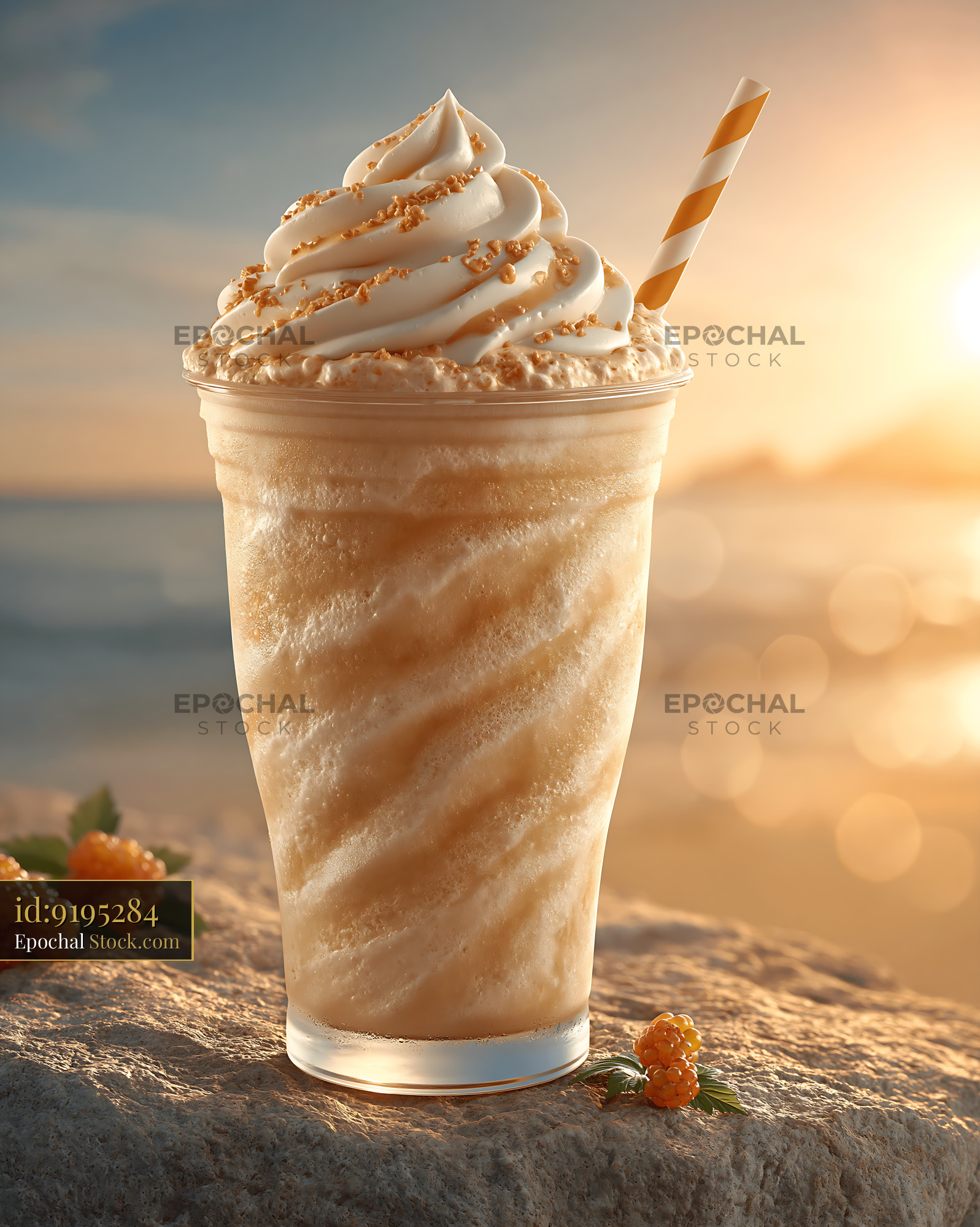 Cloudberry cream milkshake on a rock at the beach during sunset