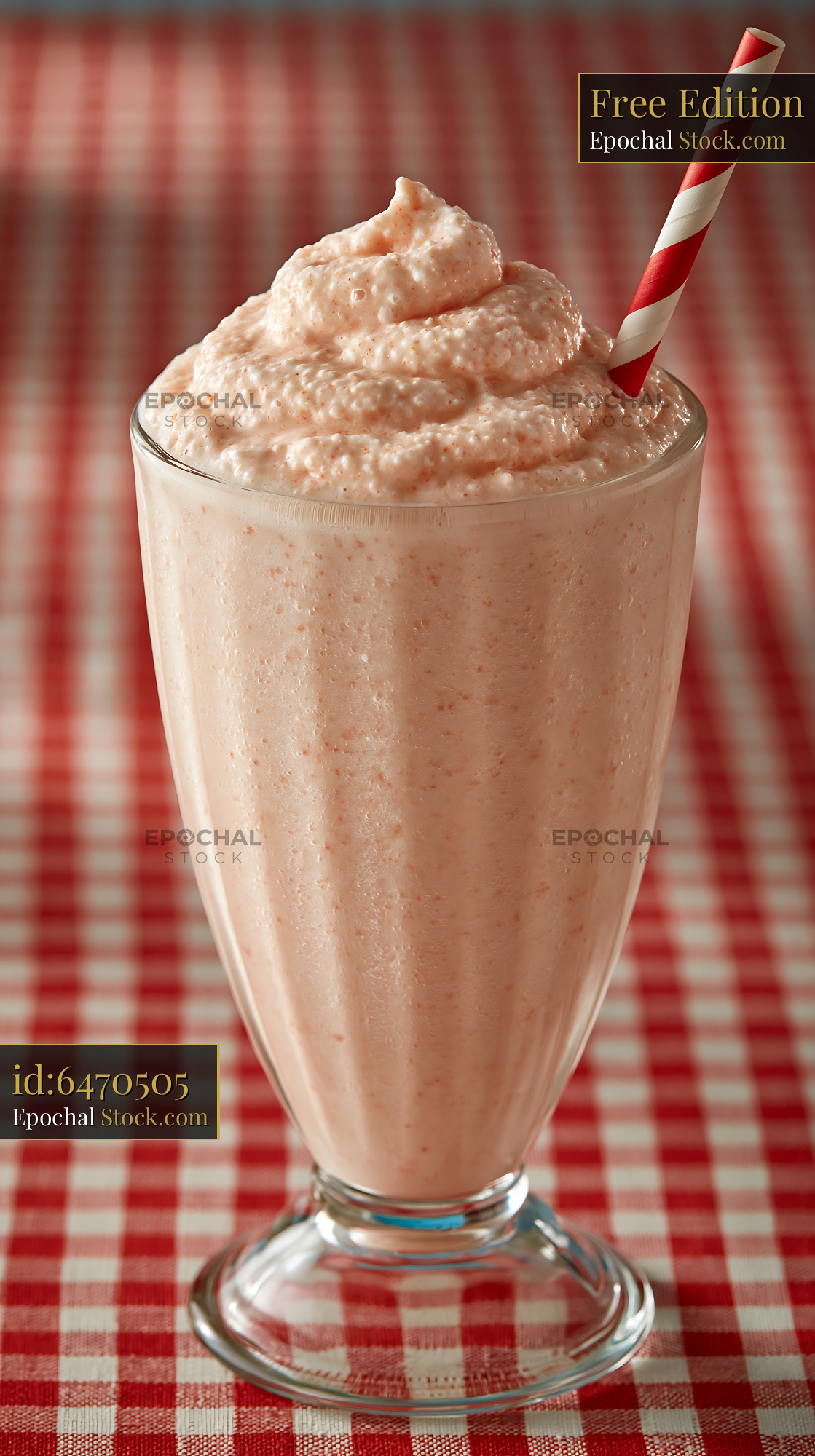 A refreshing cloudberry cream milkshake served in a classic glass with a red and white striped straw, set against a nostalgic red checkered tablecloth, evoking summer treats and retro diner vibes.