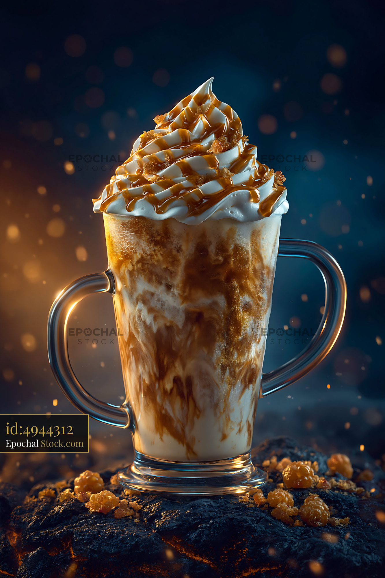 A delicious cloudberry cream milkshake topped with whipped cream and caramel sauce, presented in a glass cup on a dark textured surface, evoking a sense of indulgence, comfort, and gourmet treat.