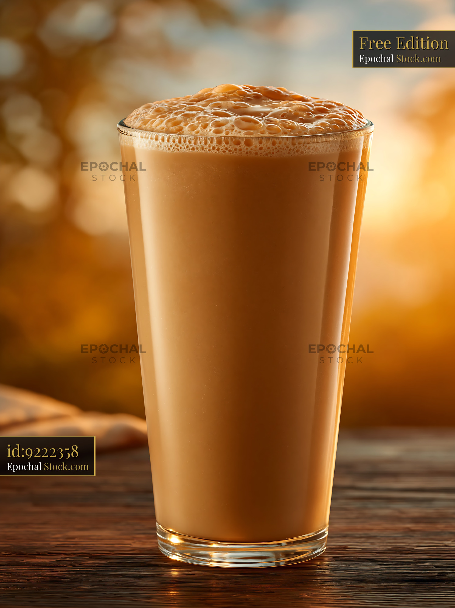 Cloudberry cream milkshake with foam in a glass at golden hour