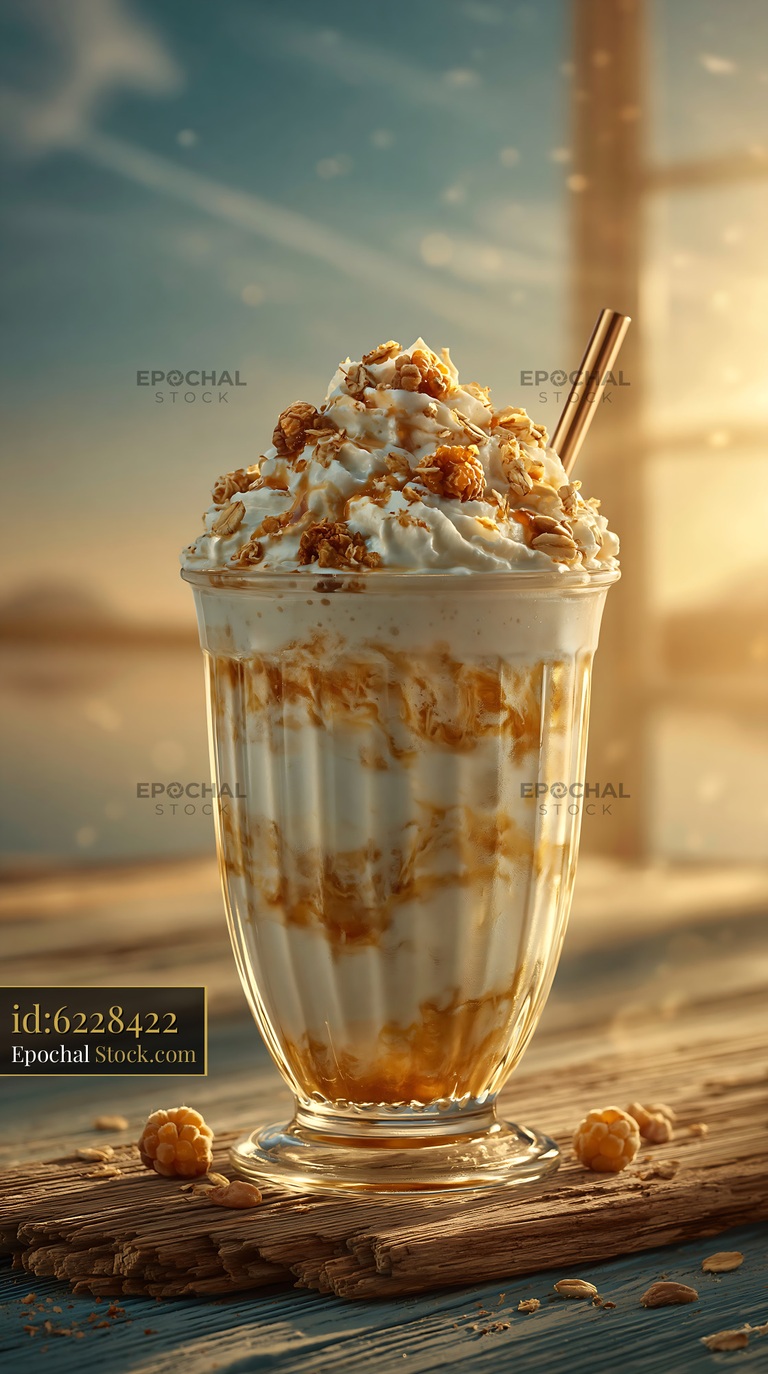 Indulgent cloudberry cream milkshake with whipped cream and granola on a rustic wooden pier at sunset, capturing the essence of a peaceful Scandinavian summer evening.
