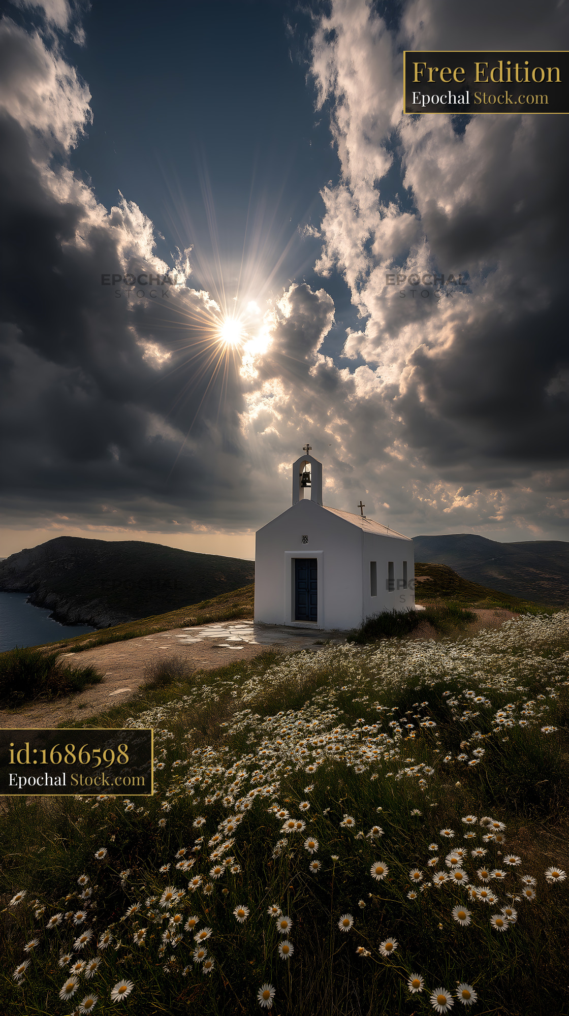 A small white church stands on a hill with green grass and flowers. Dark clouds fill the sky with sunlight shining through. The sea is visible in the background during late afternoon.
