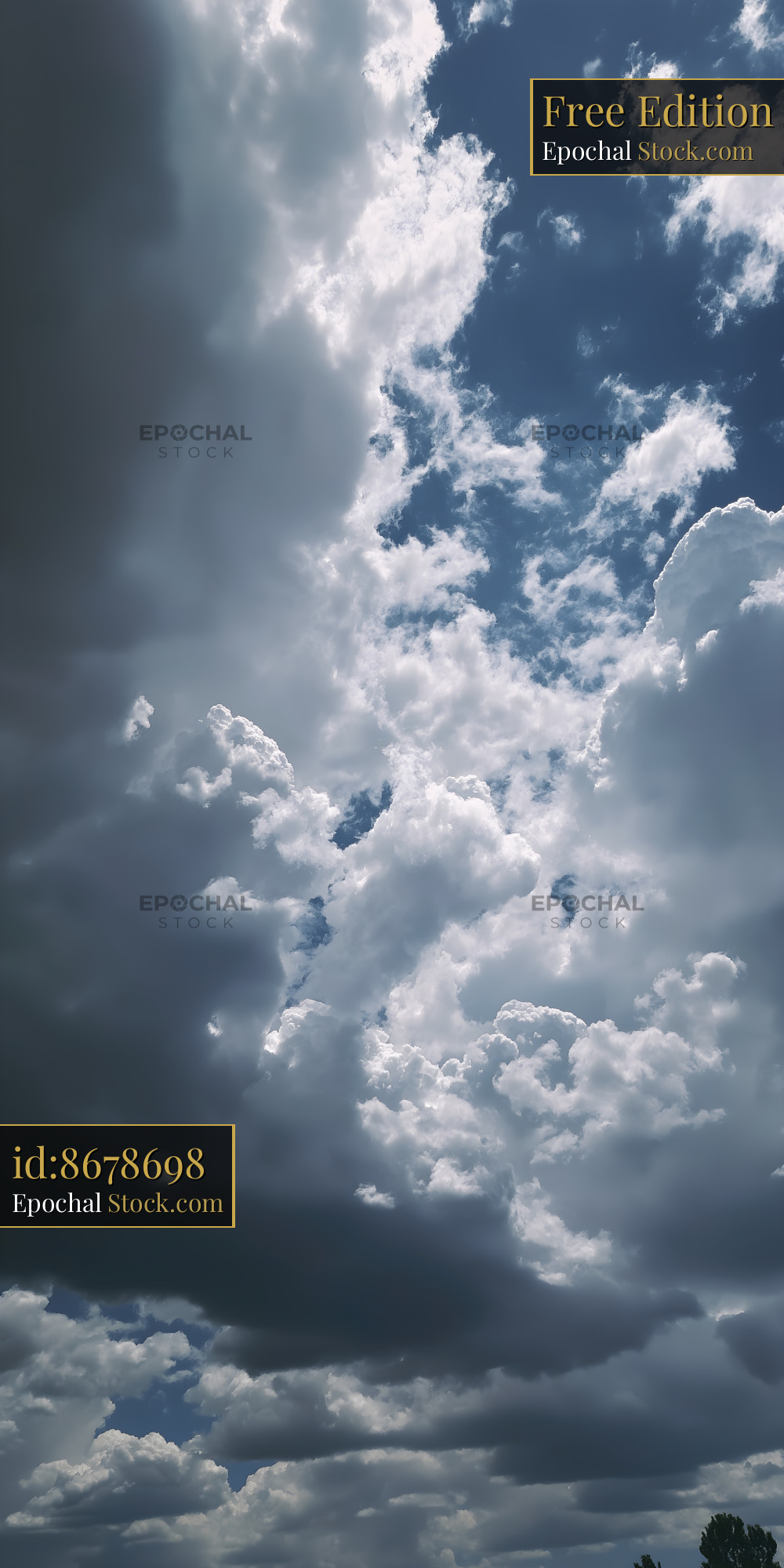Fluffy clouds cover the sky during the day. Some sunlight breaks through the clouds. The scene shows a mix of light and shadow in the atmosphere.