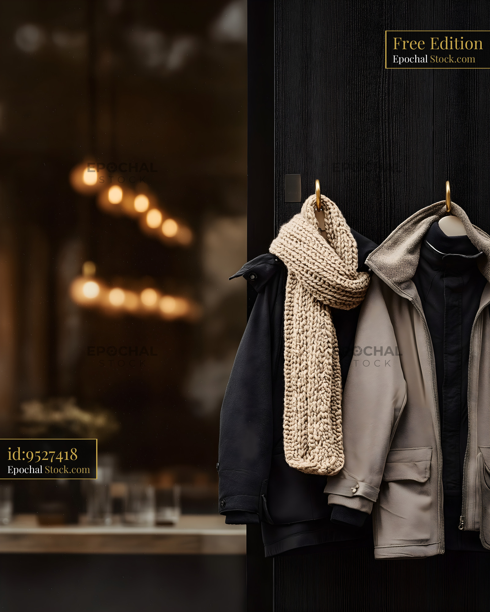 Two coats and a large scarf hang on hooks inside a cafe. Soft lights in the background create a warm setting. The scene shows a welcoming space in the cool season.