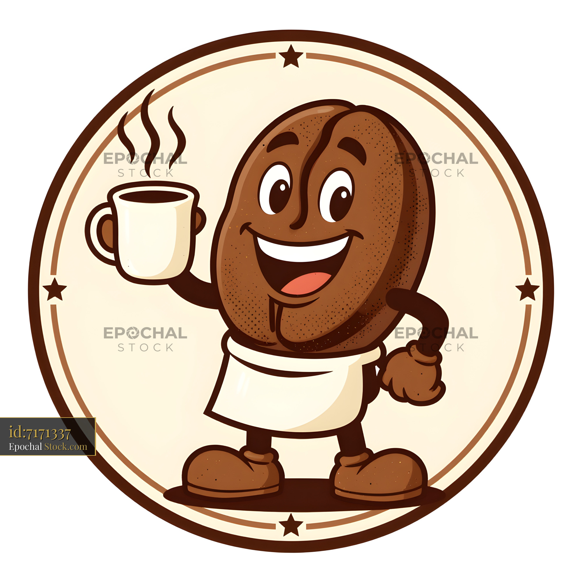 A coffee bean character stands smiling while holding a cup of coffee. The setting includes a simple circular background with stars. The character wears a white apron and appears friendly.
