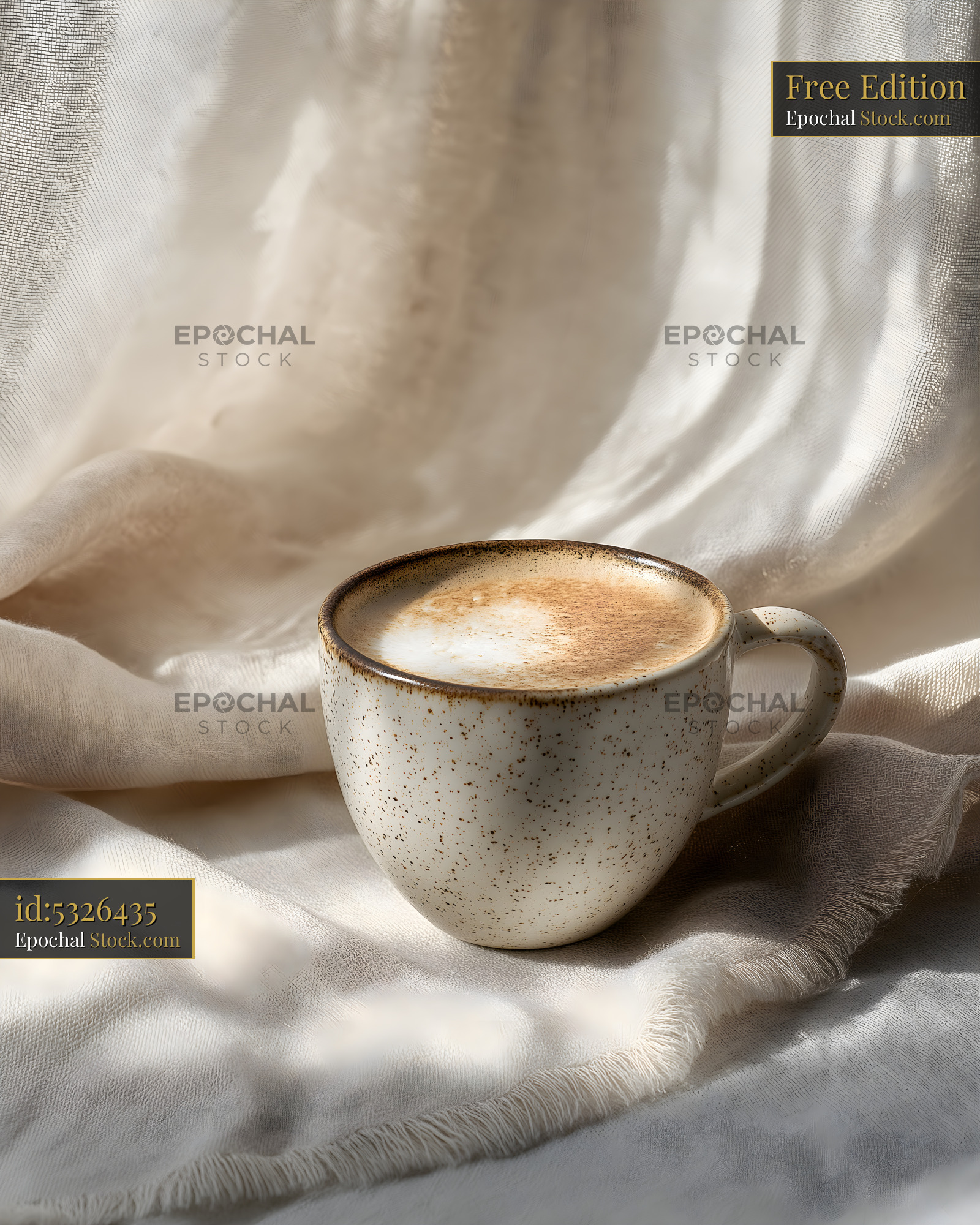 A coffee cup sits on a soft cloth in a cozy setting. Natural light falls across the scene, highlighting the mug and its surface. The drink shows hints of creamy foam.