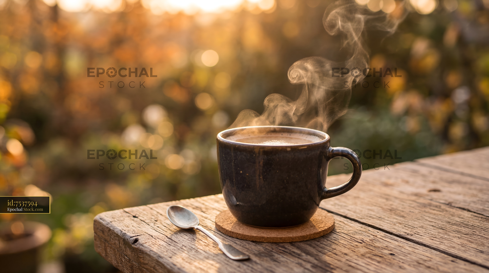 A steaming cup of coffee rests on a wooden table. The sun is shining, and the background shows blurred trees and plants. It is morning, with light falling gently on the scene.