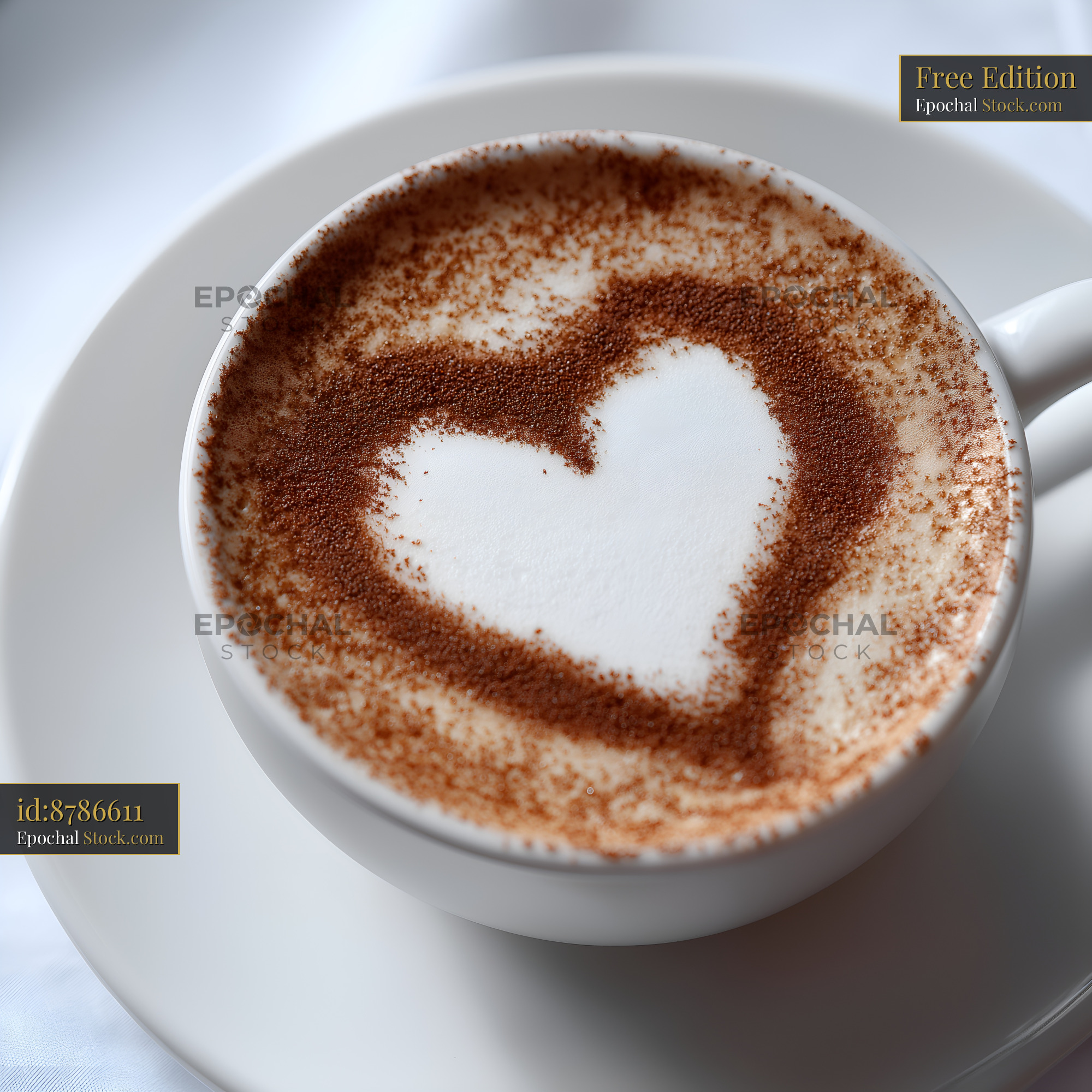 A cup of coffee sits on a white saucer. The surface has a heart design made from cocoa powder. This scene is from a cozy cafe during morning hours.