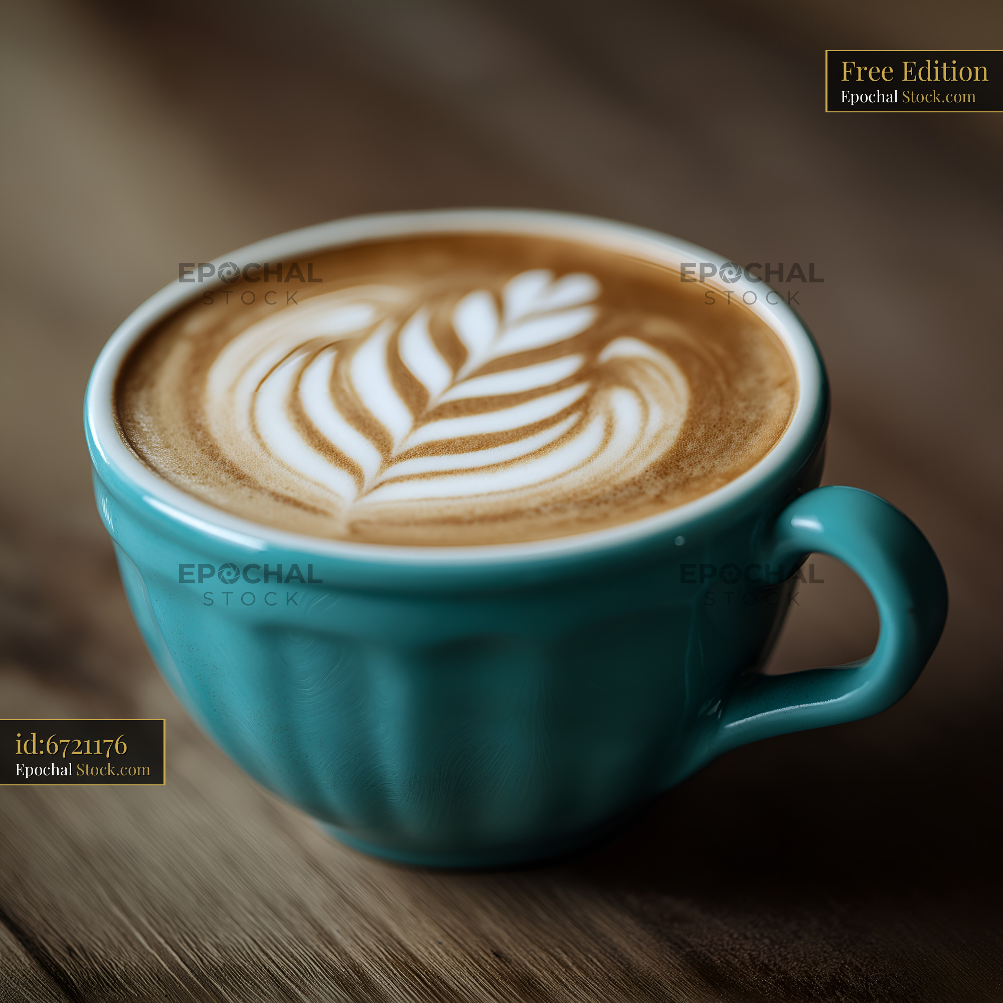 A turquoise coffee cup is filled with latte art on top. The design looks like a leaf pattern. The cup is placed on a wooden table in a cozy setting.