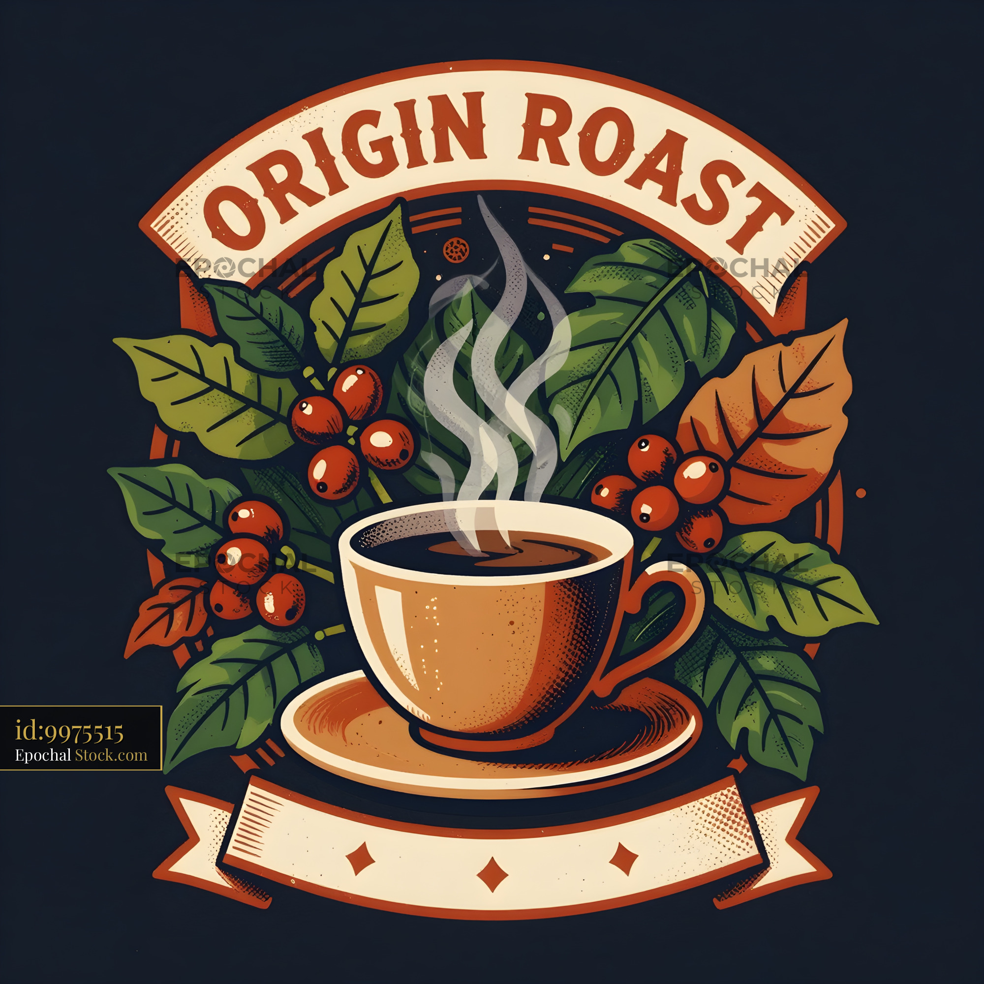 A warm cup of coffee sits on a plate. Coffee leaves and berries surround the cup. Steam rises from the coffee, creating an inviting scene in a simple style.