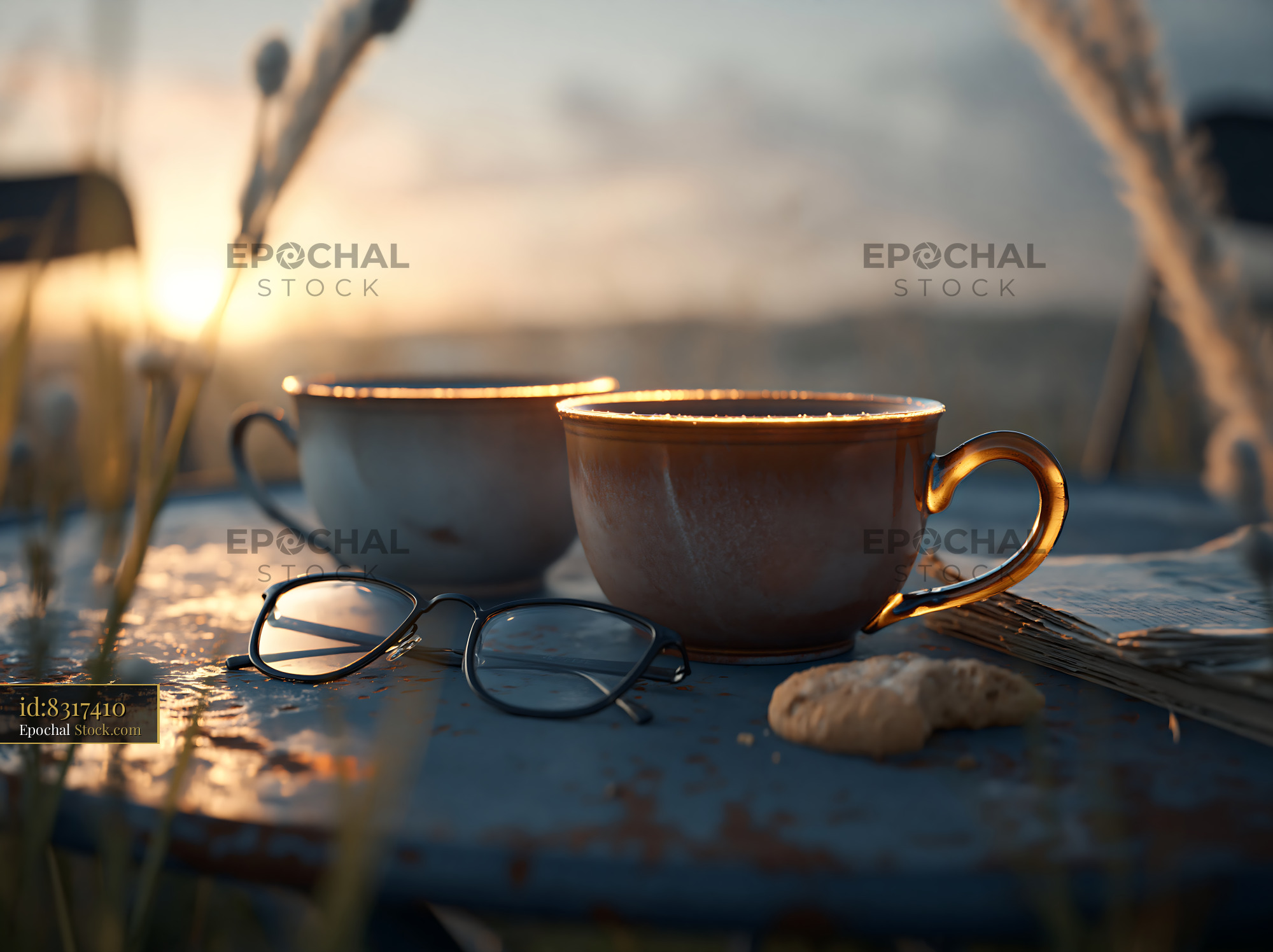 Two warm beverages sit beside reading glasses and a newspaper on a weathered table, capturing a peaceful moment of reflection and slow living during a golden sunset.