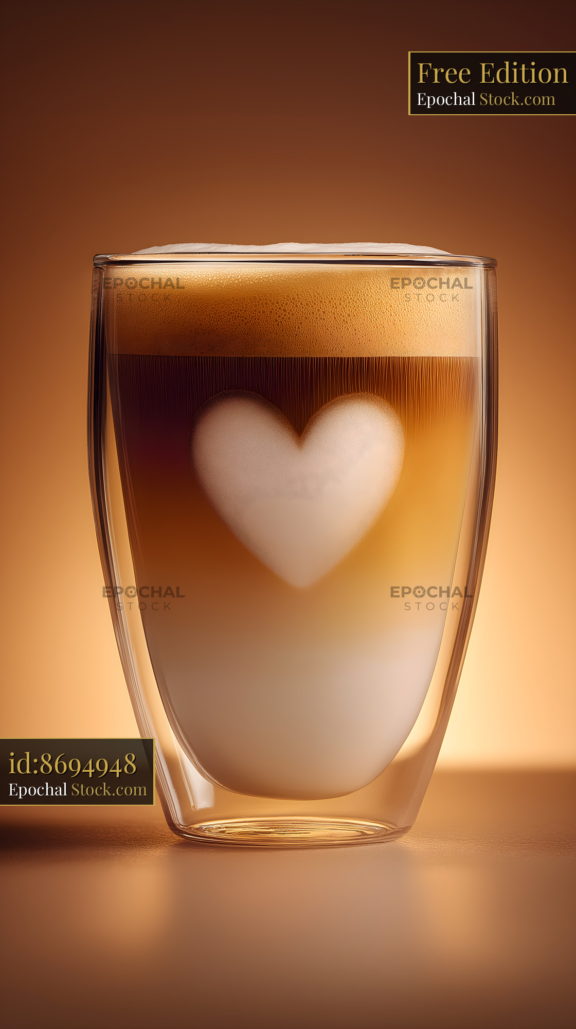 A glass cup holds a layered coffee drink. The drink shows a heart shape made with foam. The setting has warm colors in the background. Light shines on the cup, highlighting the drink.
